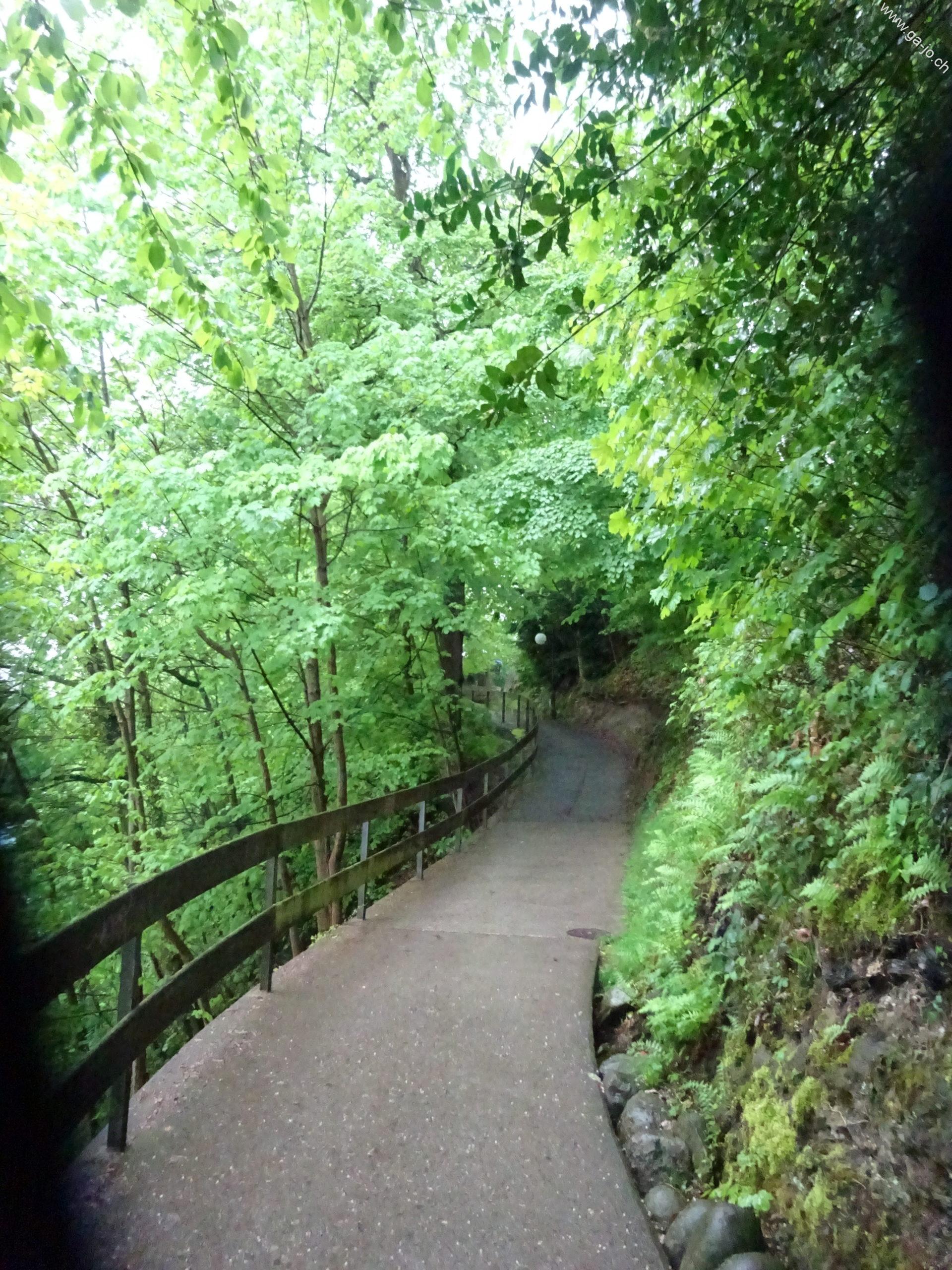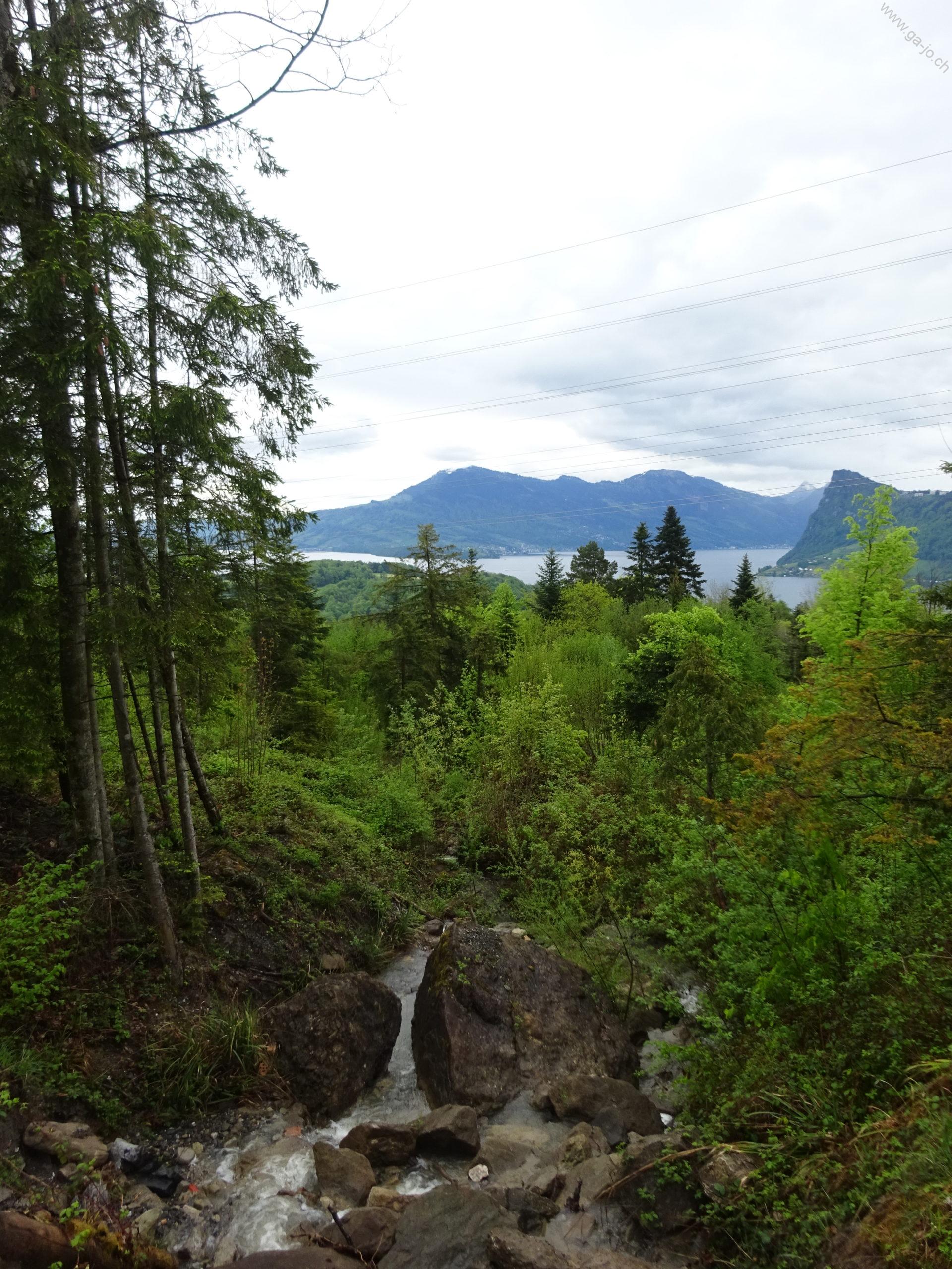 La descente du col est facile, néanmoins, la pluie récente rend le chemin un peu glissant et on décide donc de suivre la route forestière (balisage jaune) plutôt que le chemin officiel balisé en randonnée de montagne (blanc-rouge-blanc) qui, d’autre part, rejoint et longe la route cantonale. On rejoint alors la ligne de chemin de fer à crémaillère du Pilatus, nous confirmant que la gare d’Alpnachstad est proche.