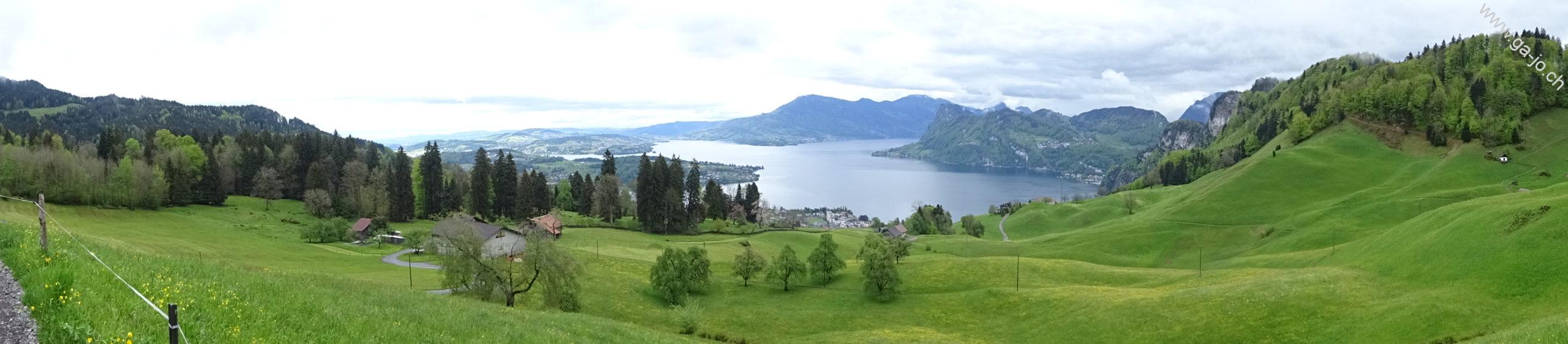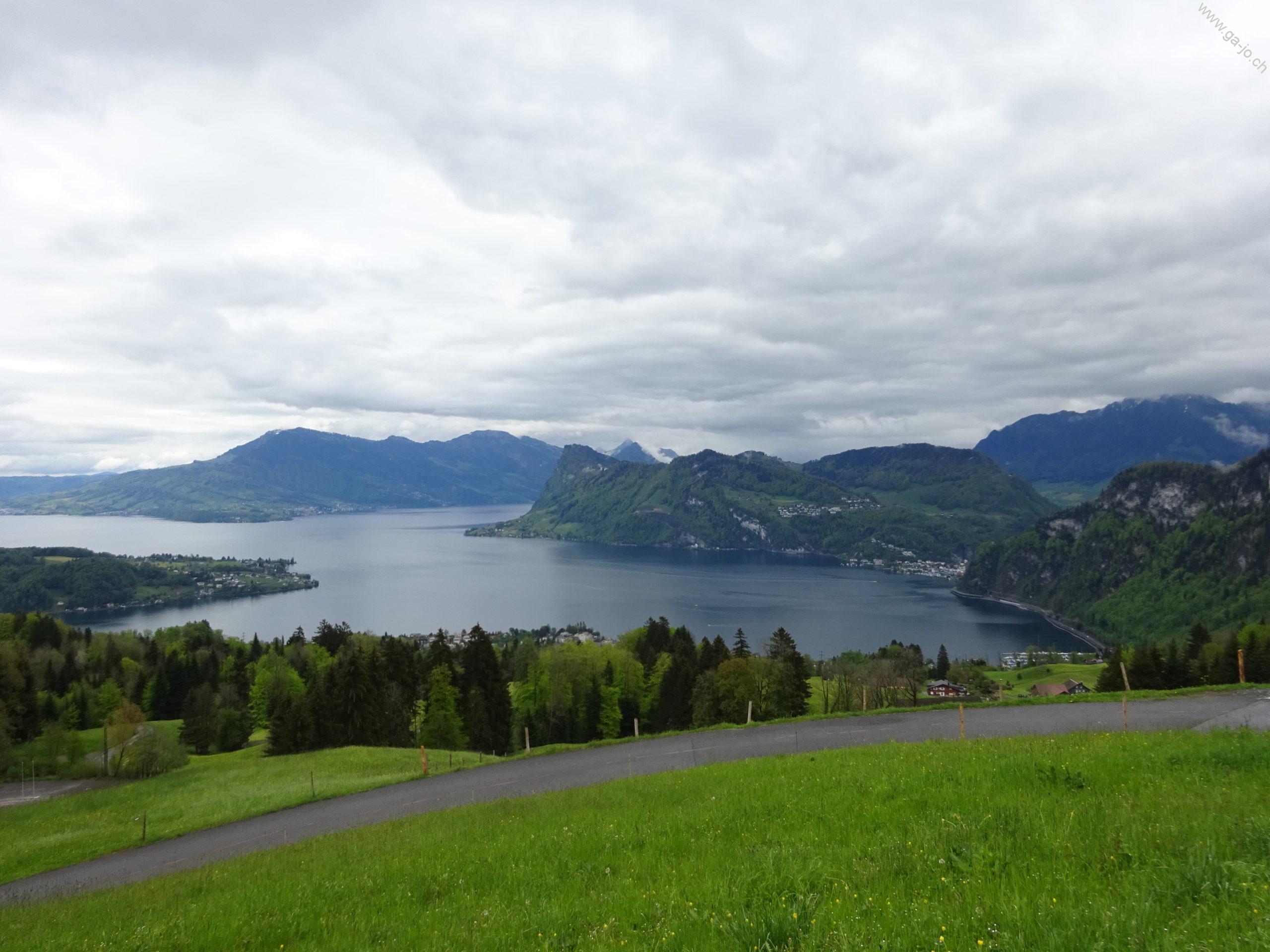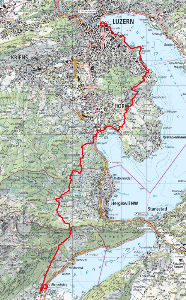 Le départ se fait de la gare de Lucerne, en suivant le balisage (Waldstätterweg 98) le long du lac, derrière le KKL. On traverse ensuite le quartier de Matthof avant de monter le long de la forêt en direction de Horw.