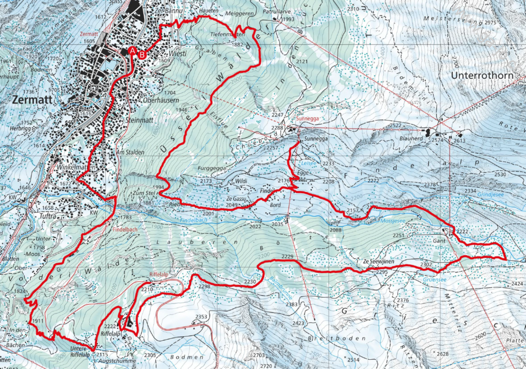 Zermatt est bien connue pour son domaine skiable, un peu moins pour ses sentier de randonnées hivernales et de raquettes. En hiver, les indicateurs jaunes disparaissent pour laisser place à la couleur rose sur un certain nombre d’itinéraire bien préparés et sécurisés. On déplorera juste que le plan de ces chemin ne soit fourni que sur un dépliant très très peu précis au lieu d’une vraie carte Swisstopo où les distances, dénivelés, et potentielles difficultés sont plus facile à évaluer (pour autant qu’on sache la lire).