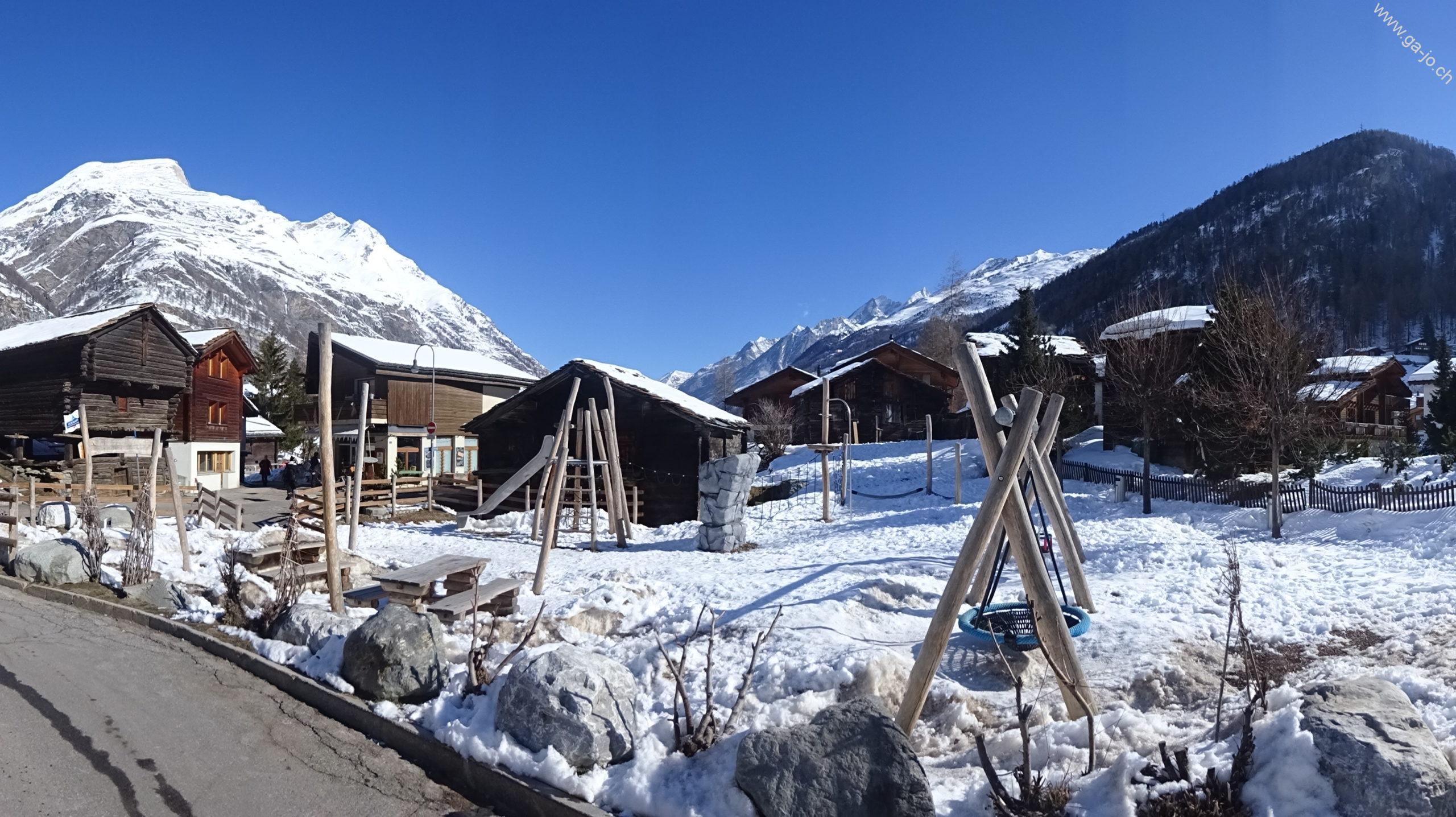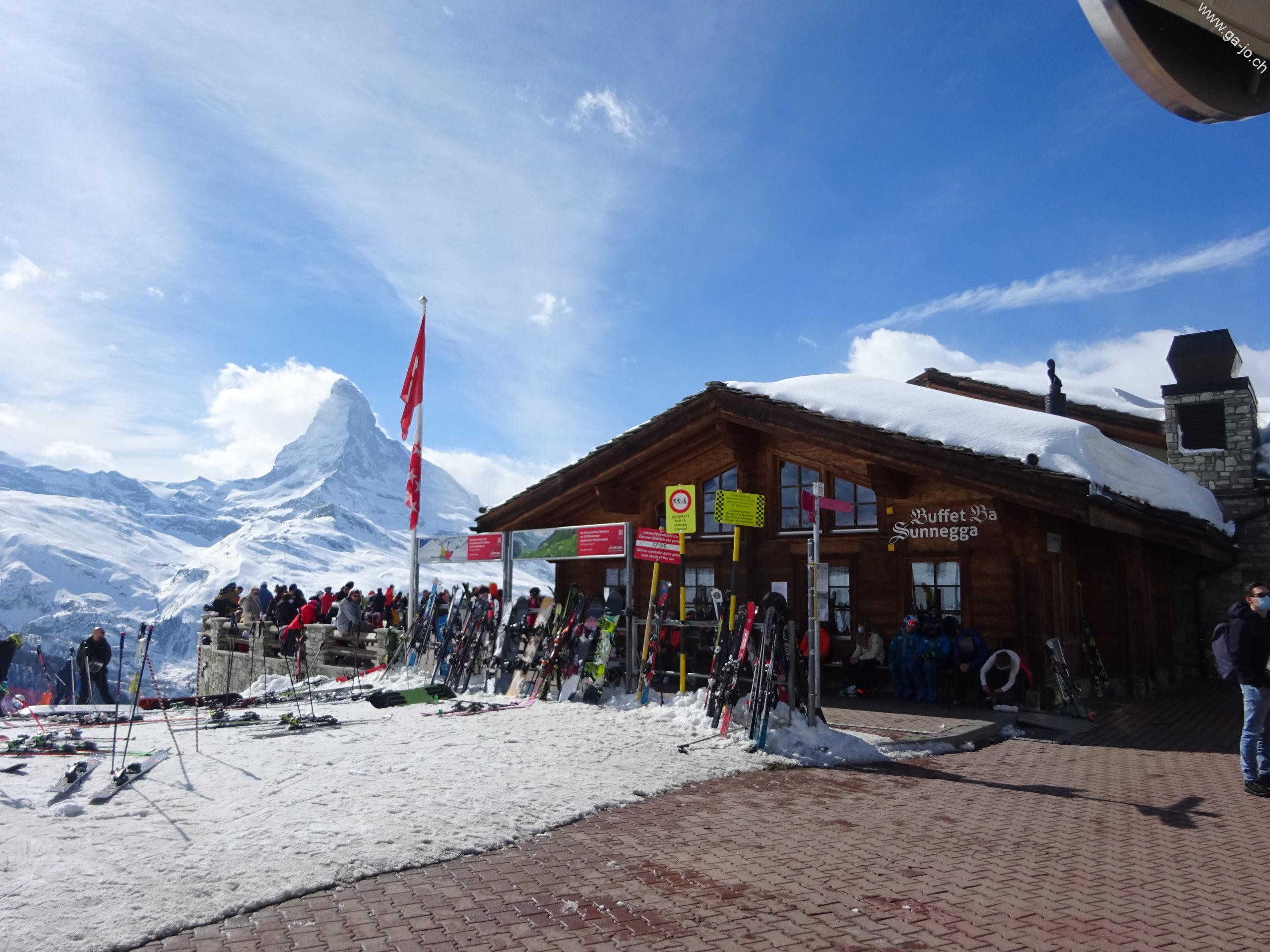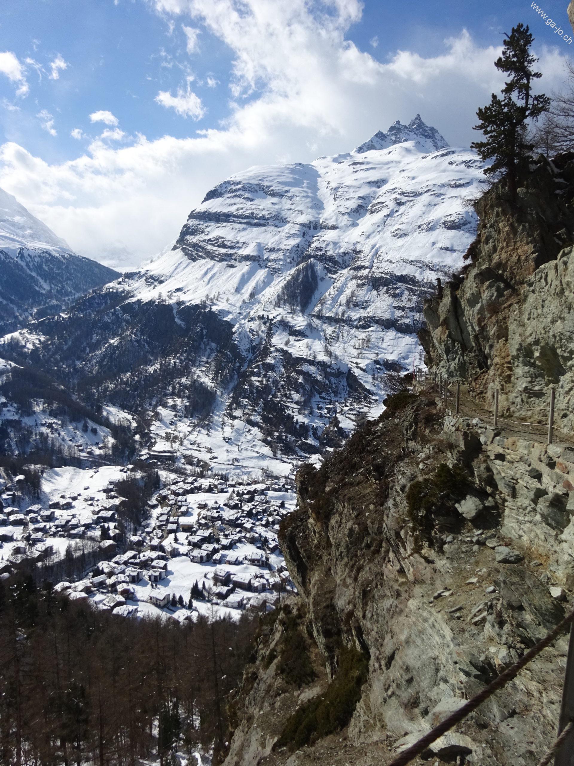 Au Charmant petit hameau de Findeln, on décidera de faire un petit détour jusqu’à Sunnegga pour y admirer un peu la vue ainsi que les terrasses “fermées” dues au mesures COVID pleines de skieurs… De retour à Findeln, on continue la descente à travers le hameau puis bifurquons sur le sentier de droite qui nous conduira jusqu’à Zermatt par la forêt. Ce chemin d’abord à flanc de côteau est impressionnant mais bien sécurisé rentre ensuite dans les bois et redescend en pente douce jusqu’à la station.