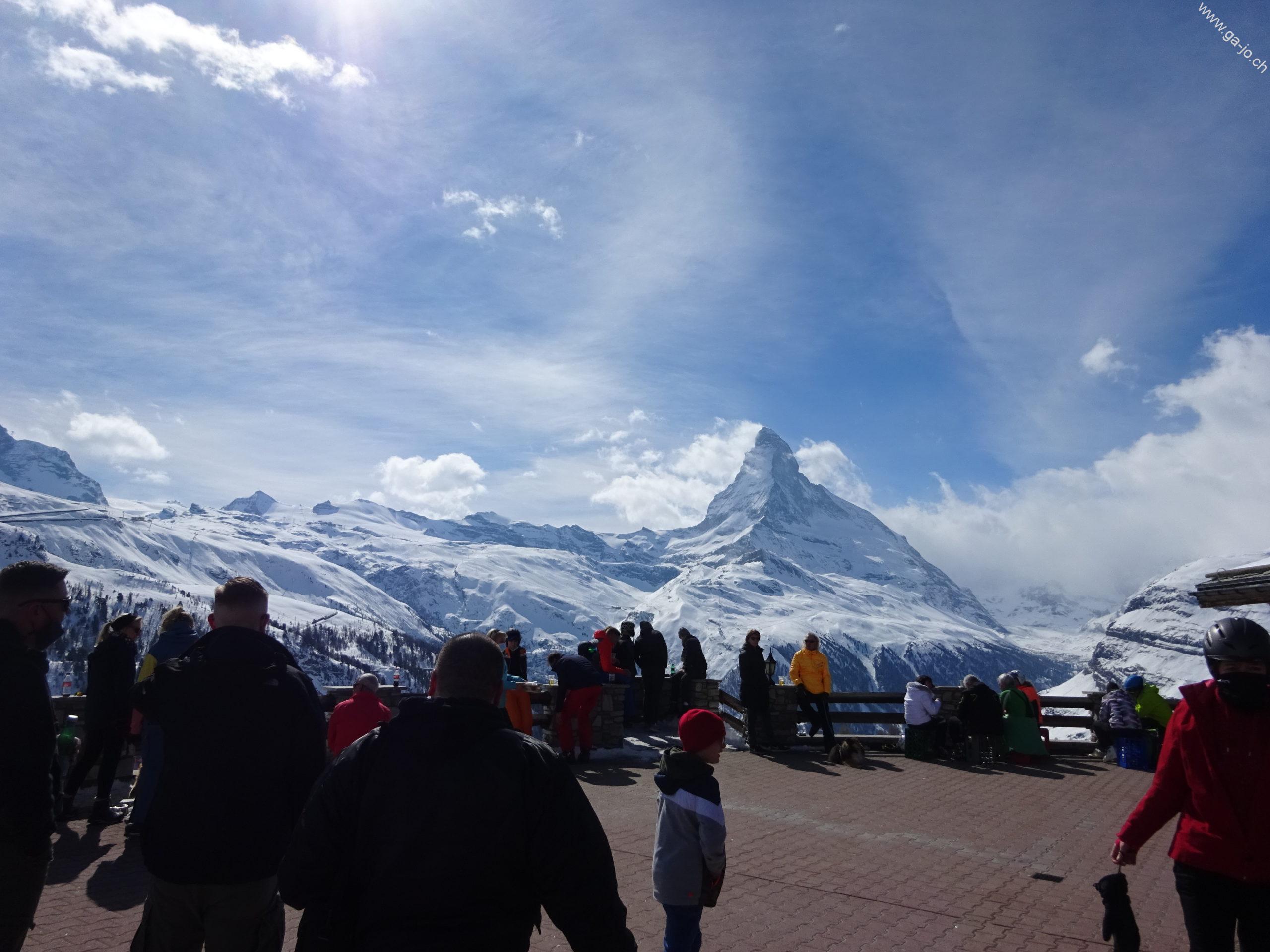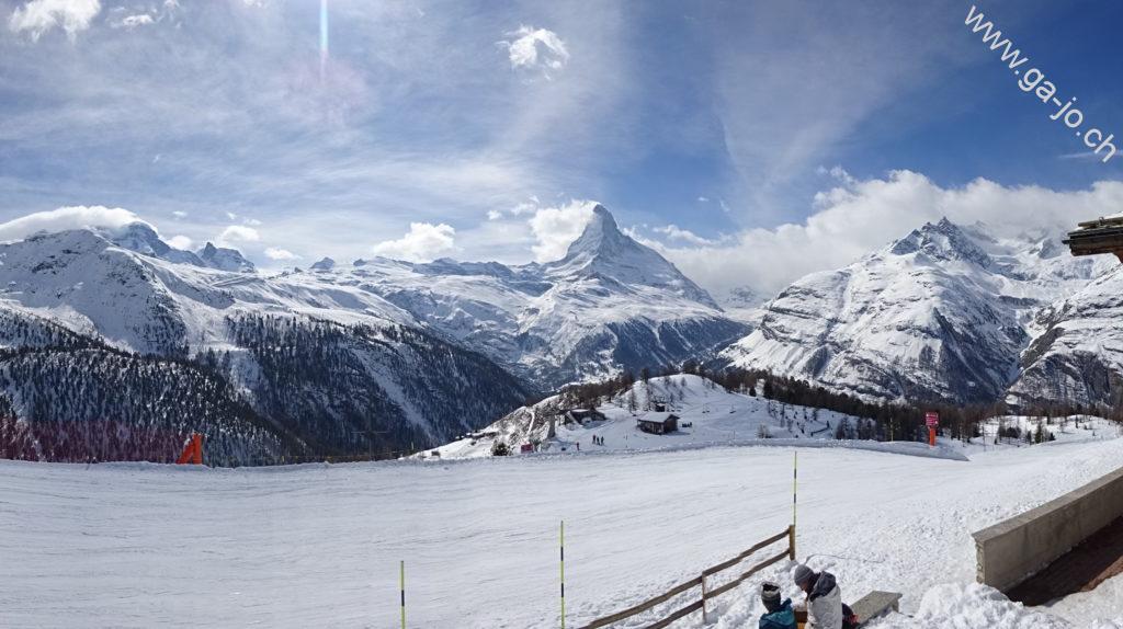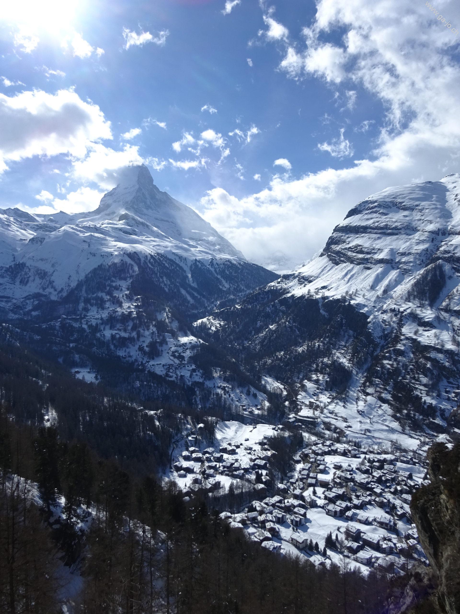Au Charmant petit hameau de Findeln, on décidera de faire un petit détour jusqu’à Sunnegga pour y admirer un peu la vue ainsi que les terrasses “fermées” dues au mesures COVID pleines de skieurs… De retour à Findeln, on continue la descente à travers le hameau puis bifurquons sur le sentier de droite qui nous conduira jusqu’à Zermatt par la forêt. Ce chemin d’abord à flanc de côteau est impressionnant mais bien sécurisé rentre ensuite dans les bois et redescend en pente douce jusqu’à la station.
