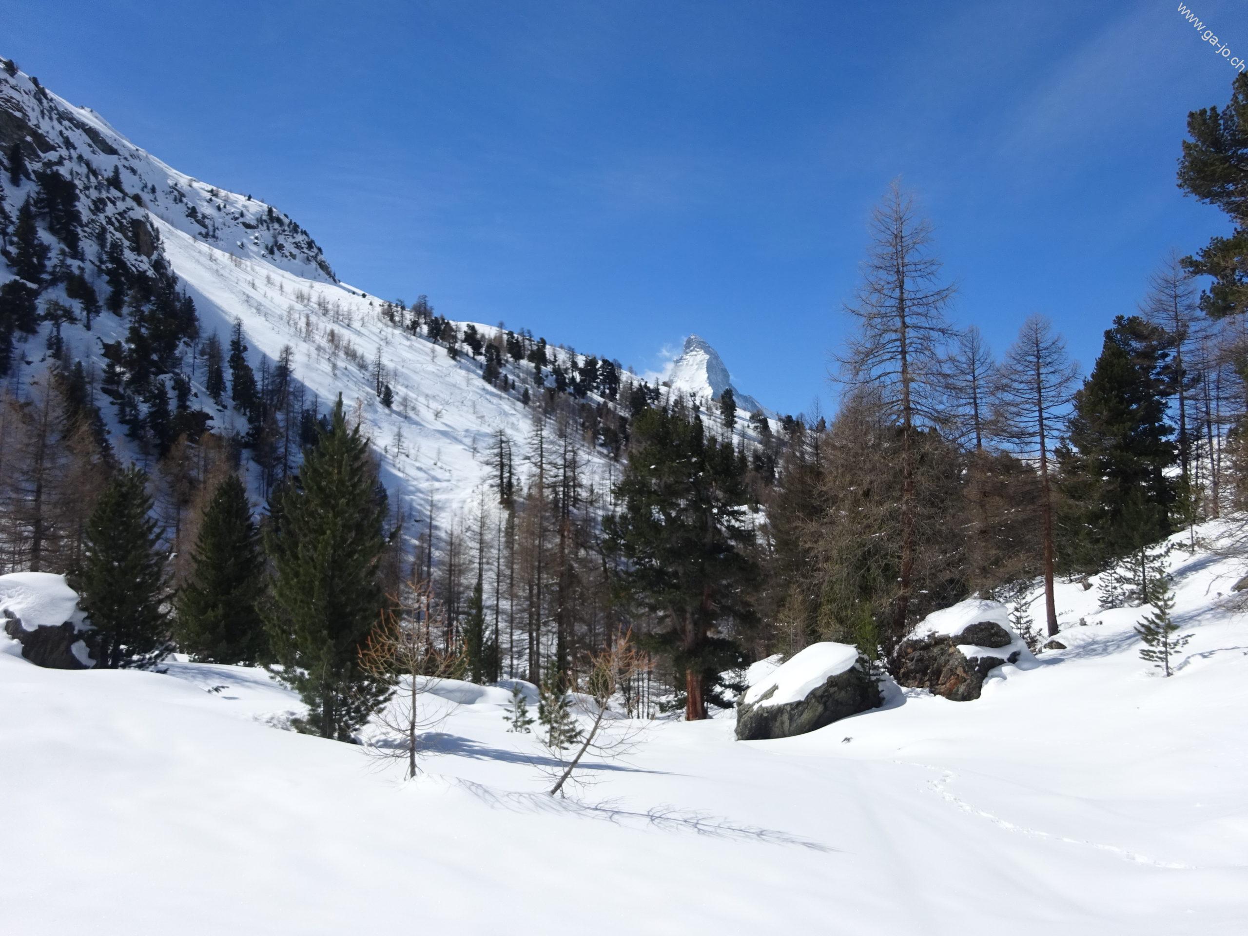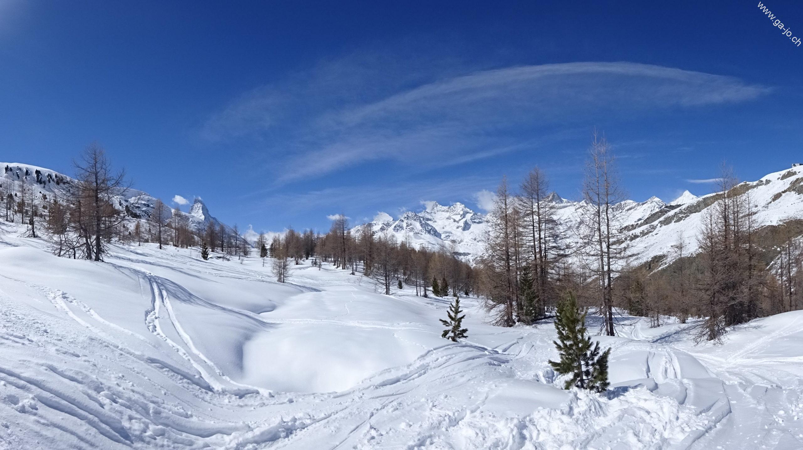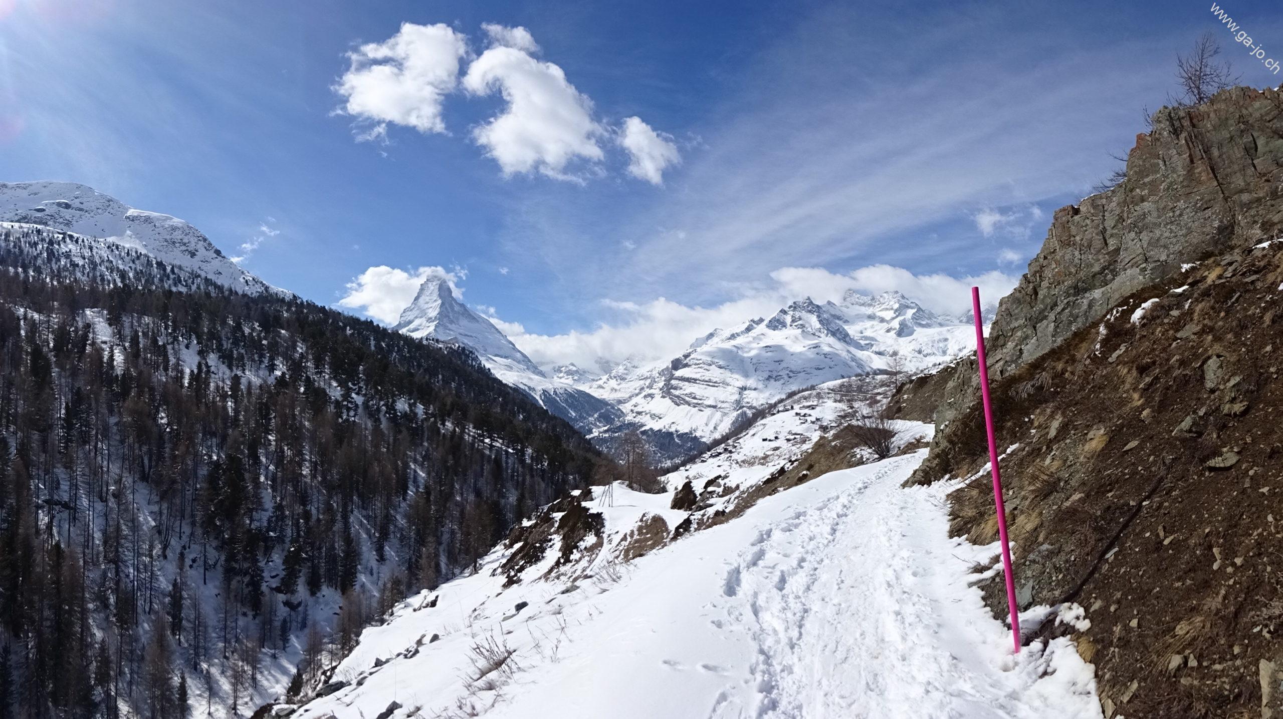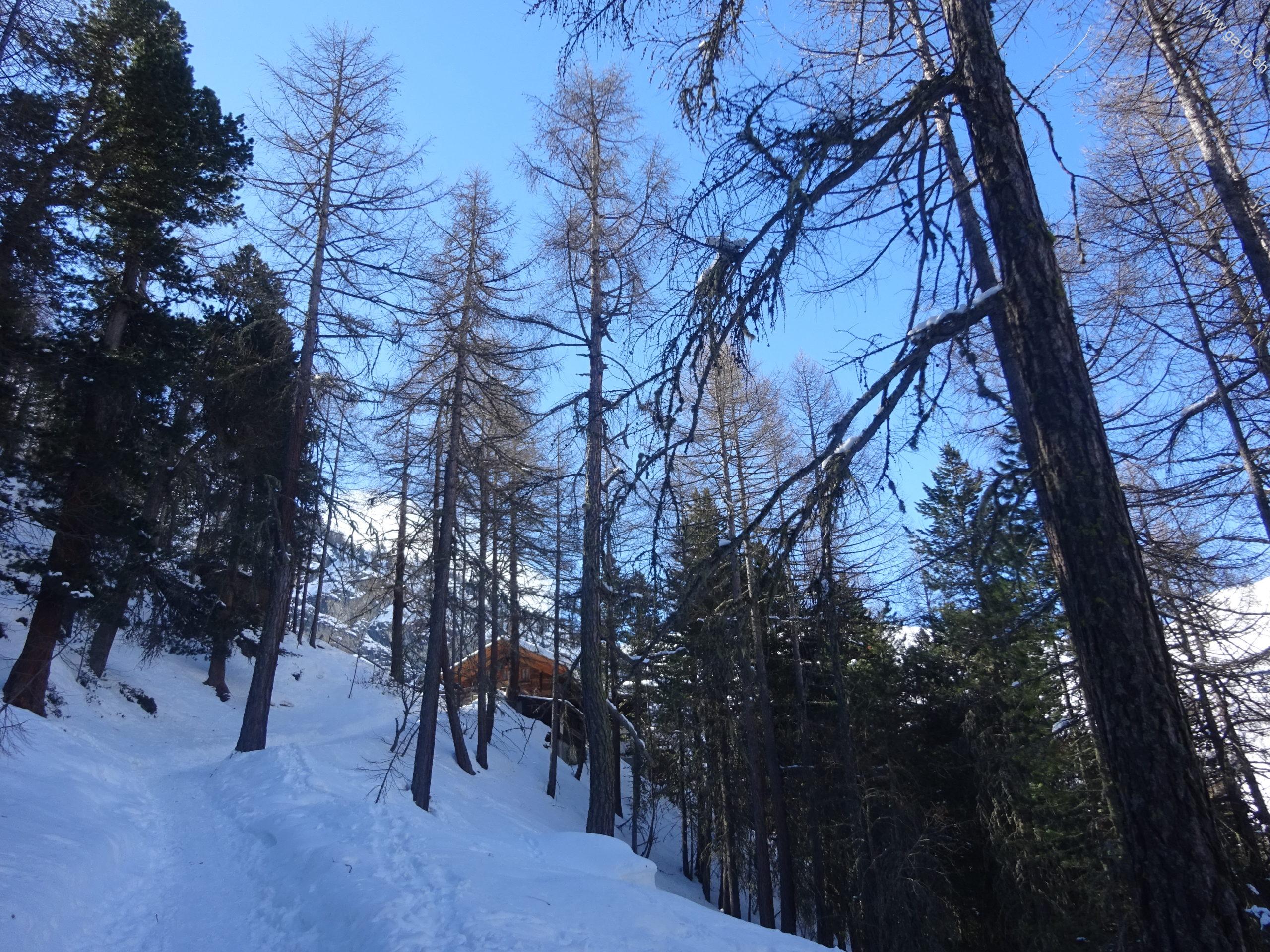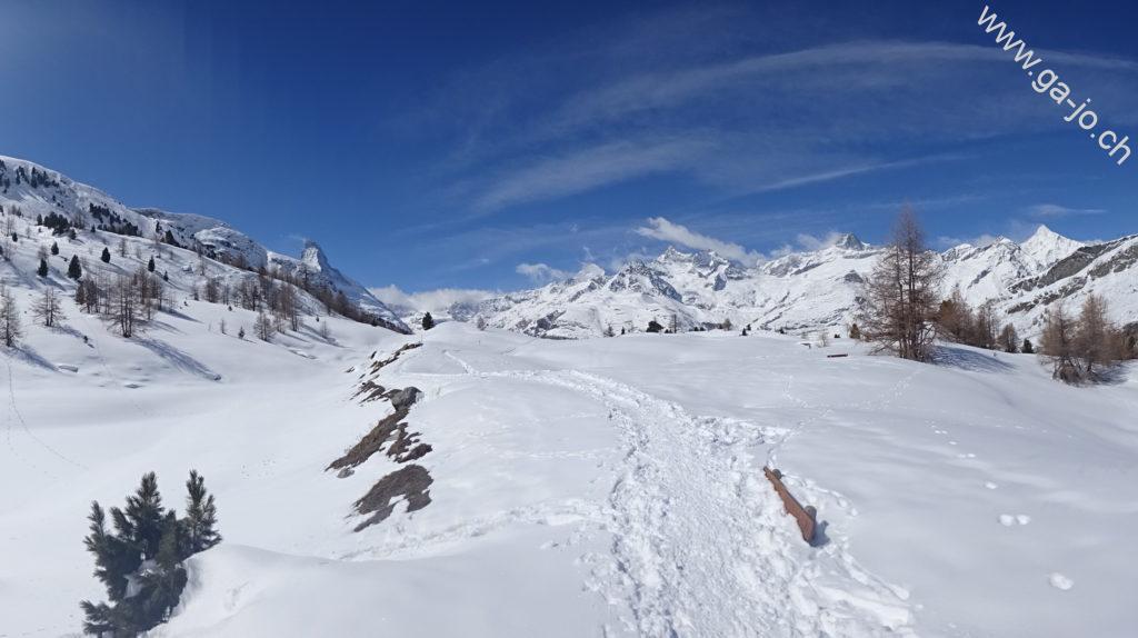 A Riffelalp le balisage est un peu confus. Deux indicateurs de raquettes sont présents mais indiquent des directions différentes et forcément, le dépliant ne nous est pas d’une grande aide. Bref, il ne faut pas suivre le chemin en direction de la gare, cette dernière ne peut pas être traversée par les piétons en hiver, en revanche il faut monter la pente au sud de l’hôtel pour le contourner par l’est et finalement rejoindre et traverser le chemin de fer quelques centaines de mettre au dessus de la gare. En suite, le chemin continue en direction E à flanc de coteau parfois dans la forêt. Le Cervin est toujours visible, derrière nous.