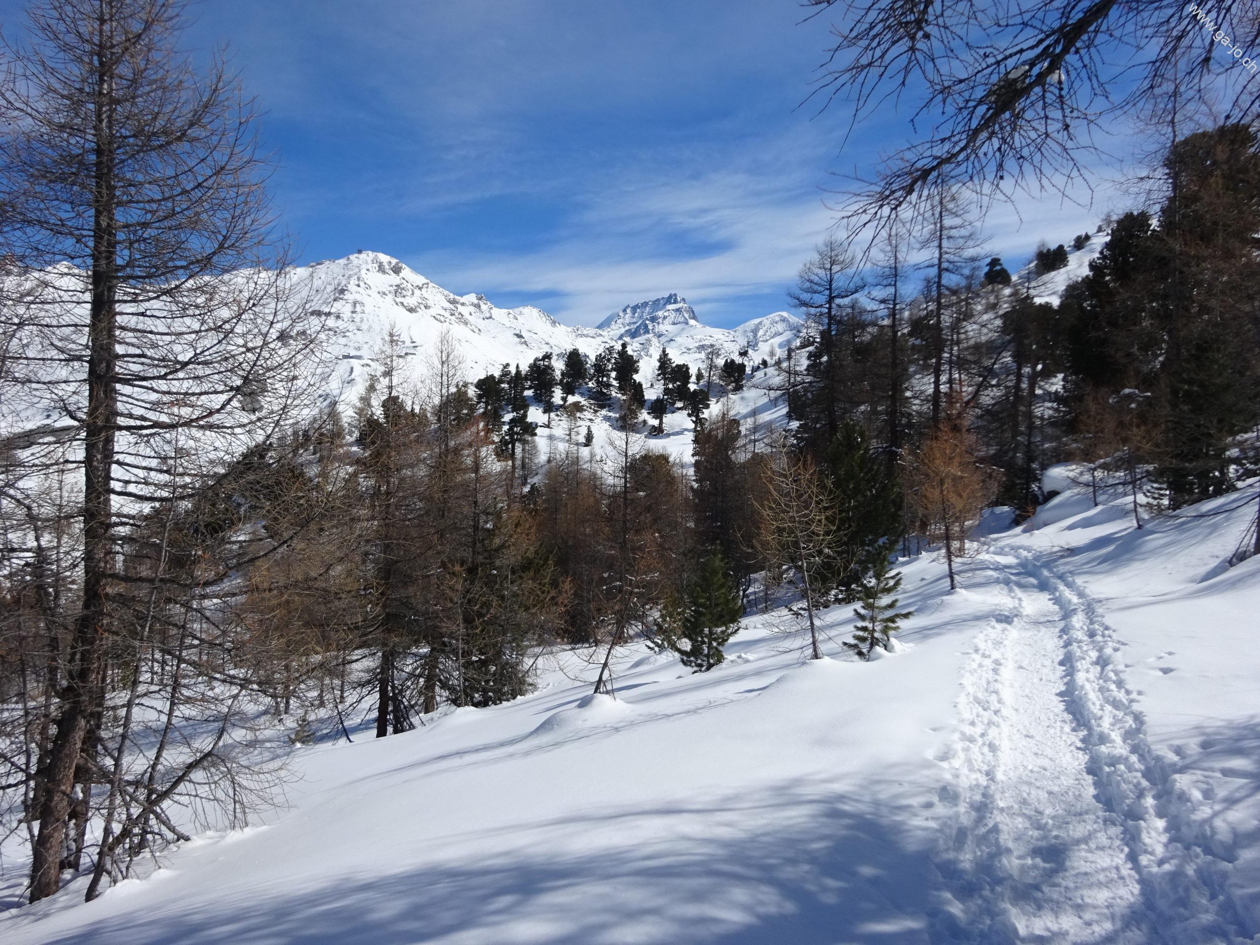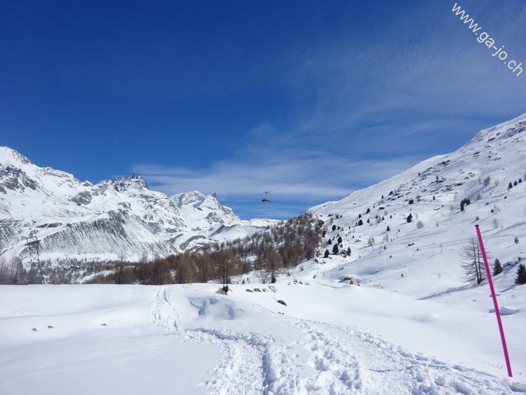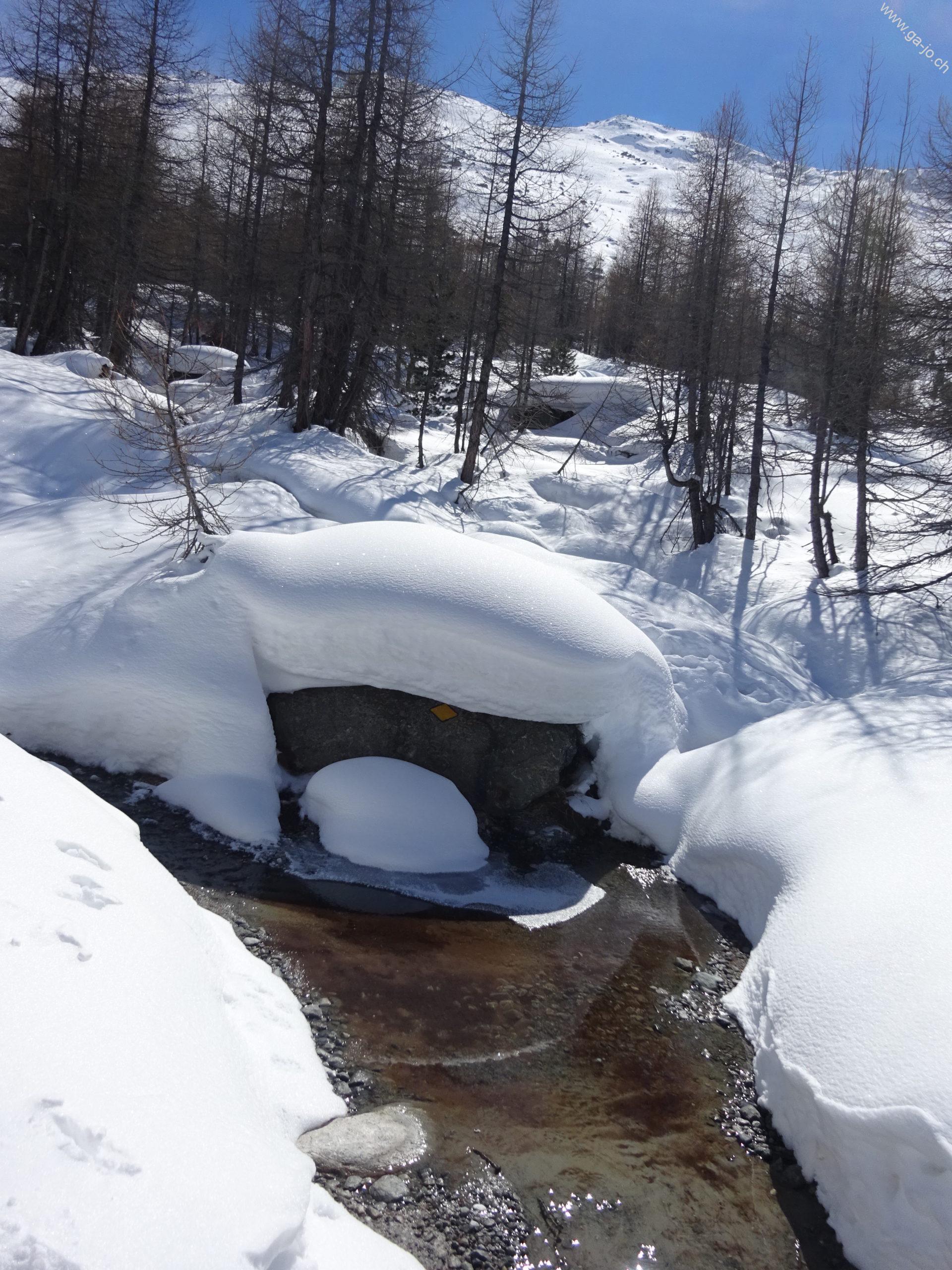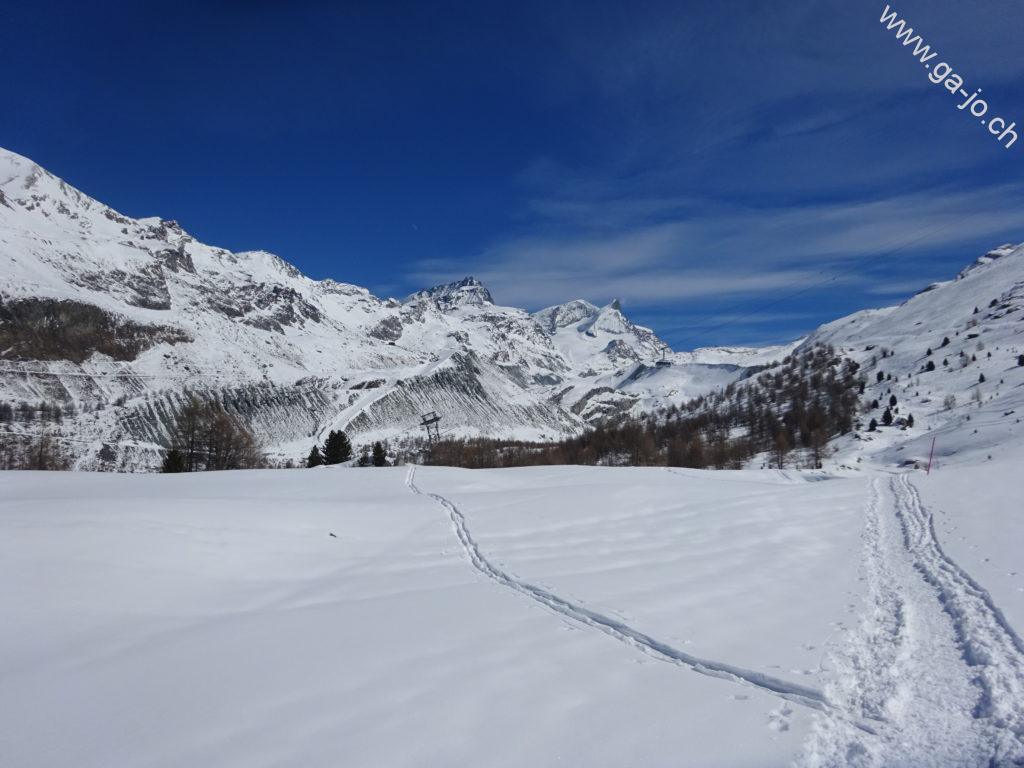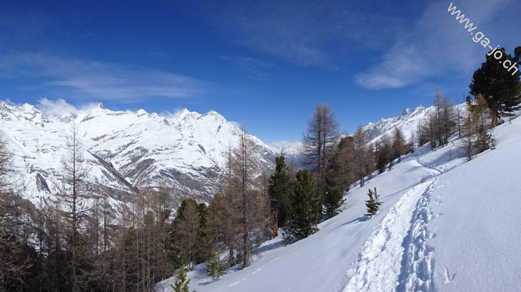 A Riffelalp le balisage est un peu confus. Deux indicateurs de raquettes sont présents mais indiquent des directions différentes et forcément, le dépliant ne nous est pas d’une grande aide. Bref, il ne faut pas suivre le chemin en direction de la gare, cette dernière ne peut pas être traversée par les piétons en hiver, en revanche il faut monter la pente au sud de l’hôtel pour le contourner par l’est et finalement rejoindre et traverser le chemin de fer quelques centaines de mettre au dessus de la gare. En suite, le chemin continue en direction E à flanc de coteau parfois dans la forêt. Le Cervin est toujours visible, derrière nous.