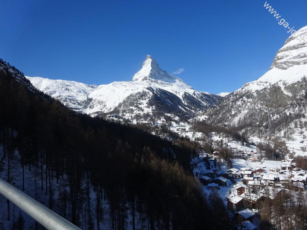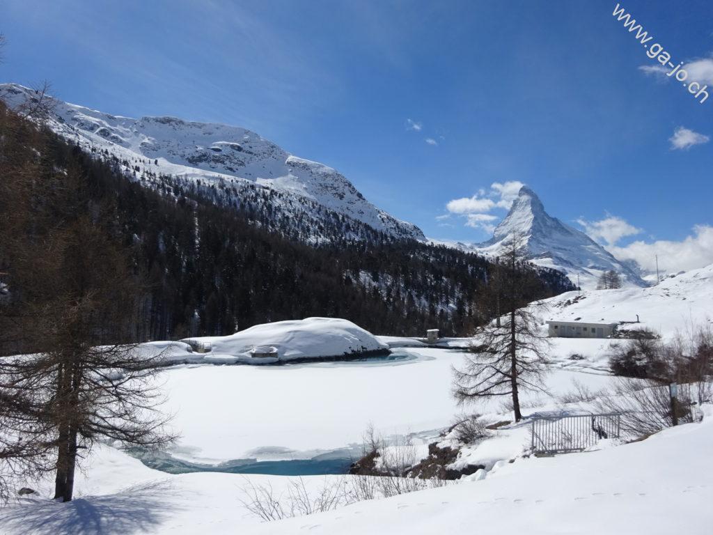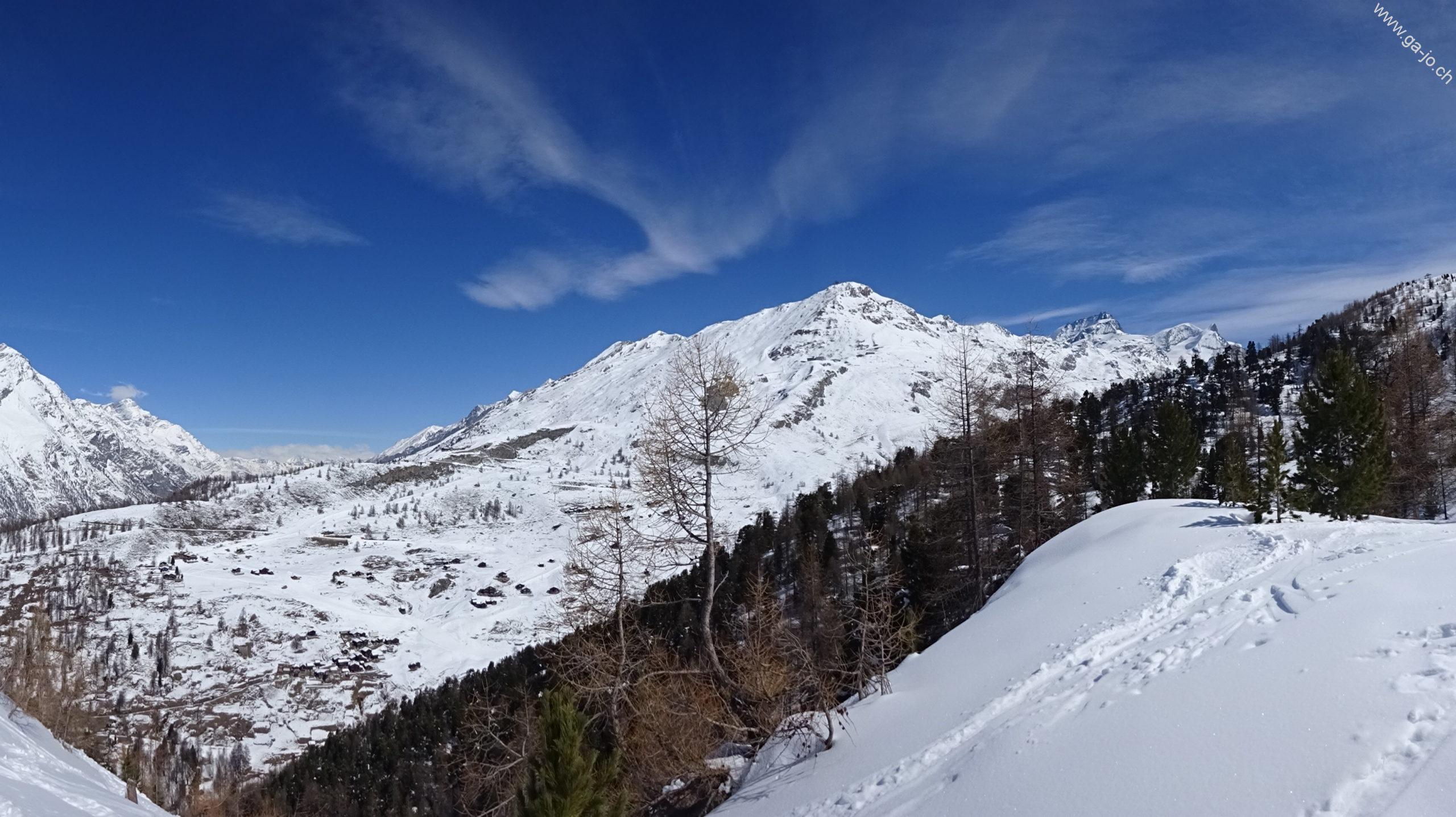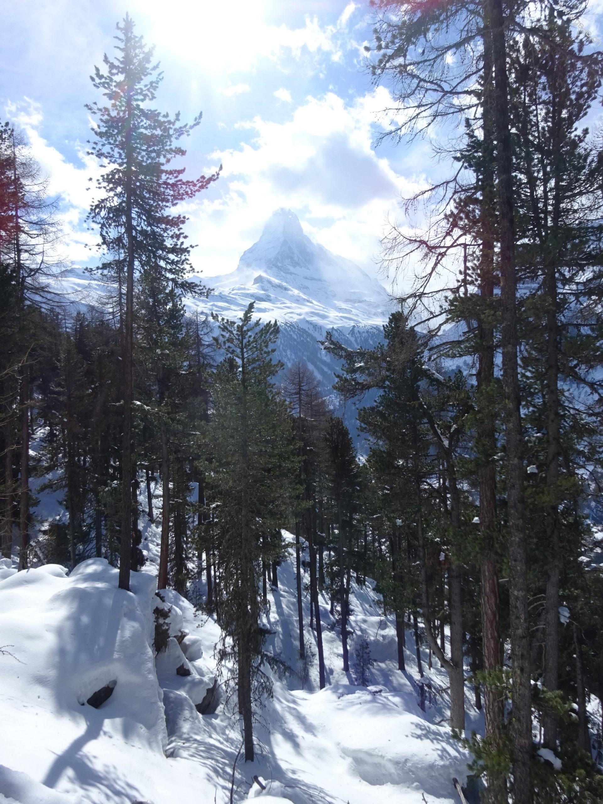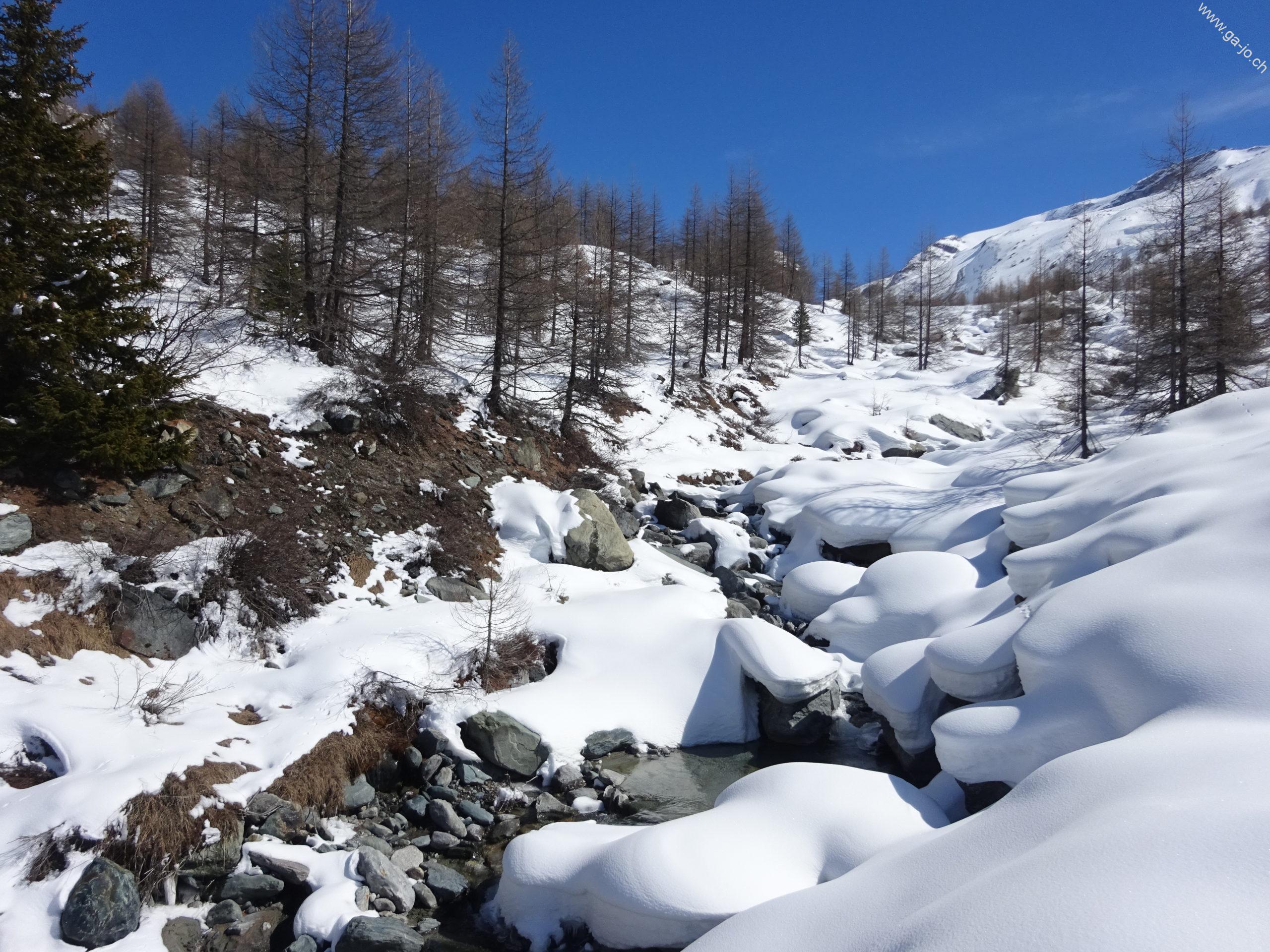 A Riffelalp le balisage est un peu confus. Deux indicateurs de raquettes sont présents mais indiquent des directions différentes et forcément, le dépliant ne nous est pas d’une grande aide. Bref, il ne faut pas suivre le chemin en direction de la gare, cette dernière ne peut pas être traversée par les piétons en hiver, en revanche il faut monter la pente au sud de l’hôtel pour le contourner par l’est et finalement rejoindre et traverser le chemin de fer quelques centaines de mettre au dessus de la gare. En suite, le chemin continue en direction E à flanc de coteau parfois dans la forêt. Le Cervin est toujours visible, derrière nous.