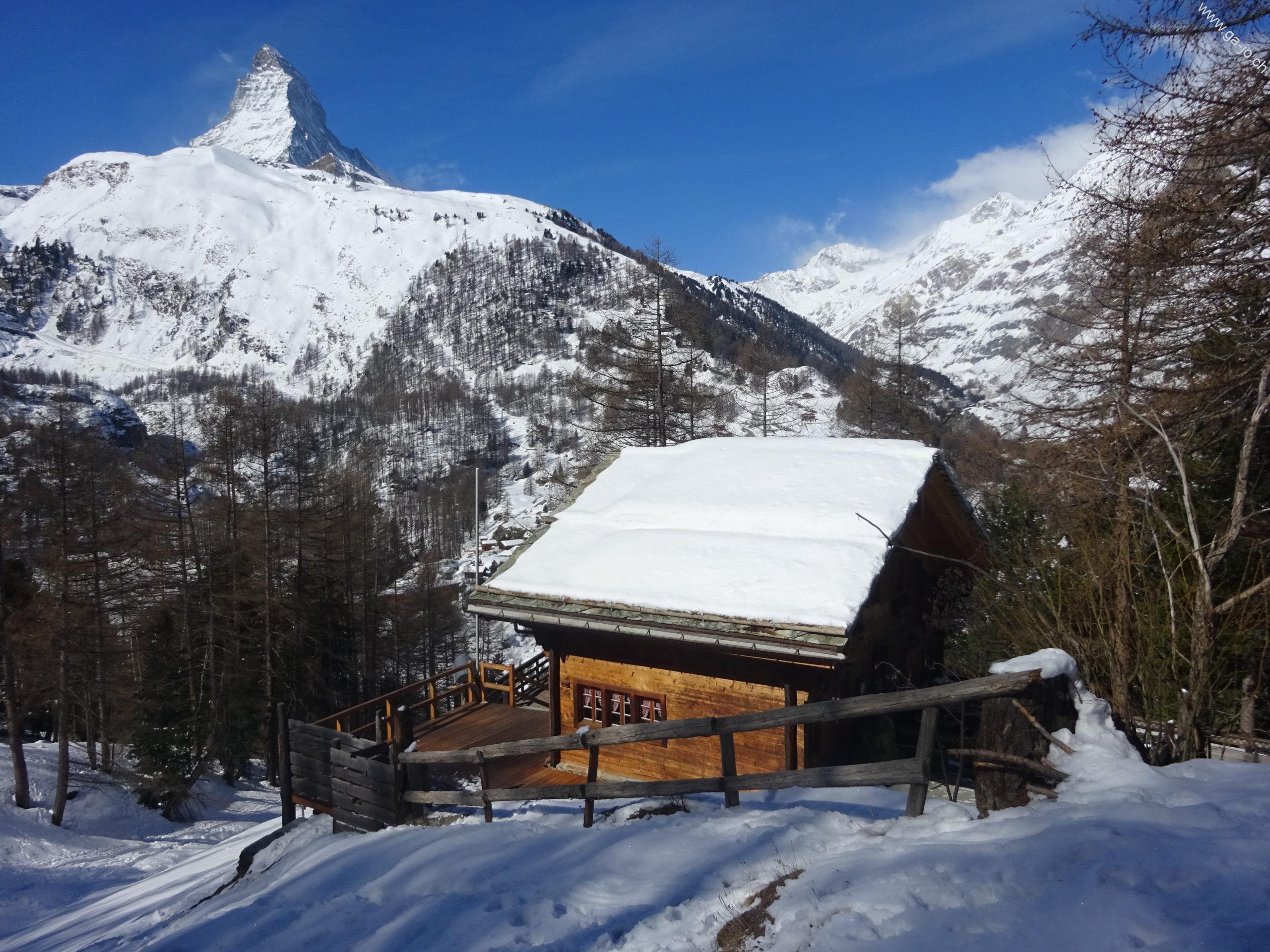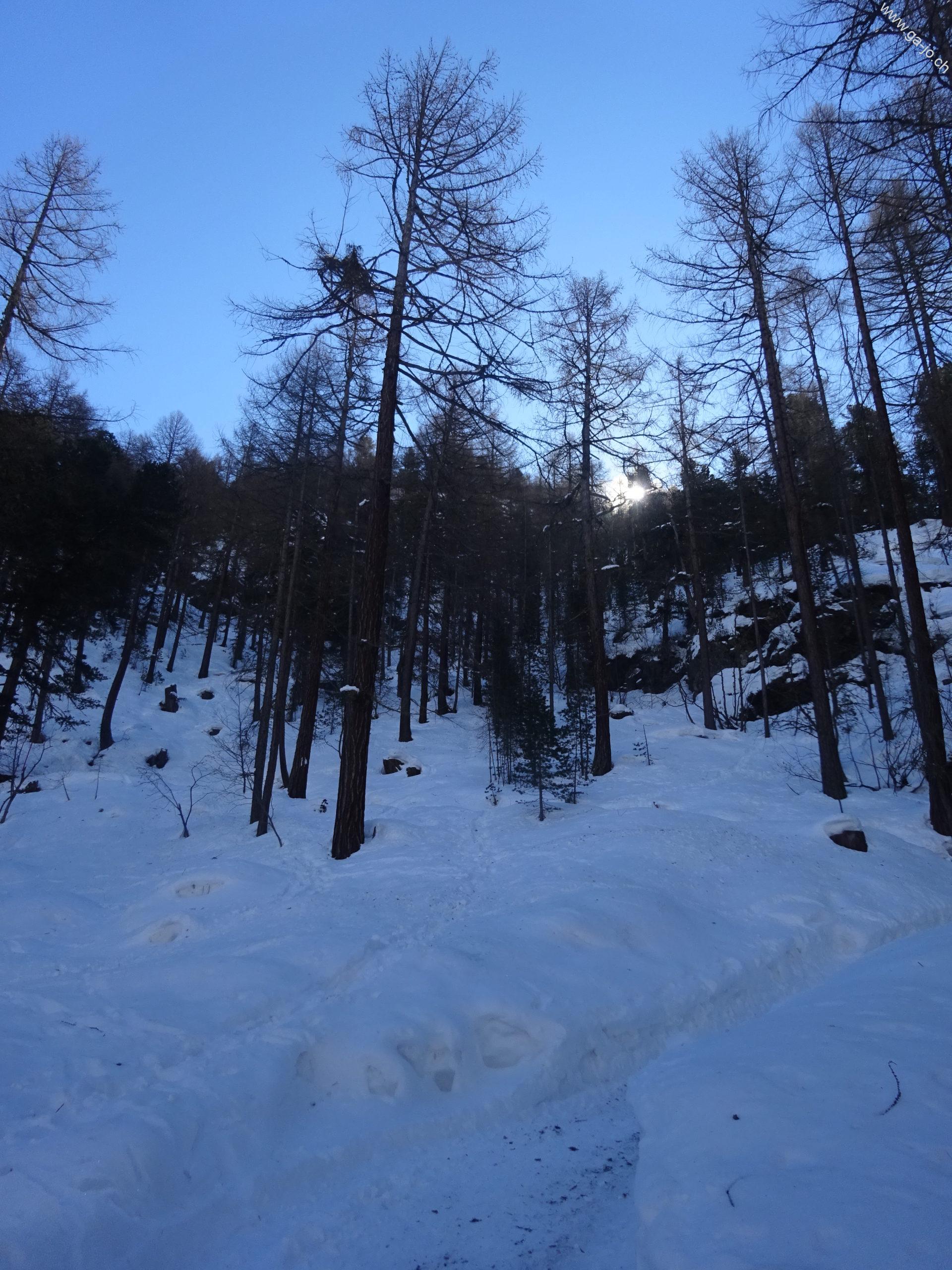 On commence donc à pieds, à travers la station en direction de Winkelmatten pour s’engager sur le chemin de randonnée hivernale menant à Riffelalp. La montée depuis l’entrée du vallon est assez exigeante physiquement. Pas besoin de raquettes pour l’instant, le sentier est dégagé et/ou bien marqué. On traverse le vallon en suivant les voies du train du Gornergrat et continuons l’ascension dans la forêt. On croise une fois ou l’autre la piste de ski avant d’arriver à l’hôtel de Riffelalp.