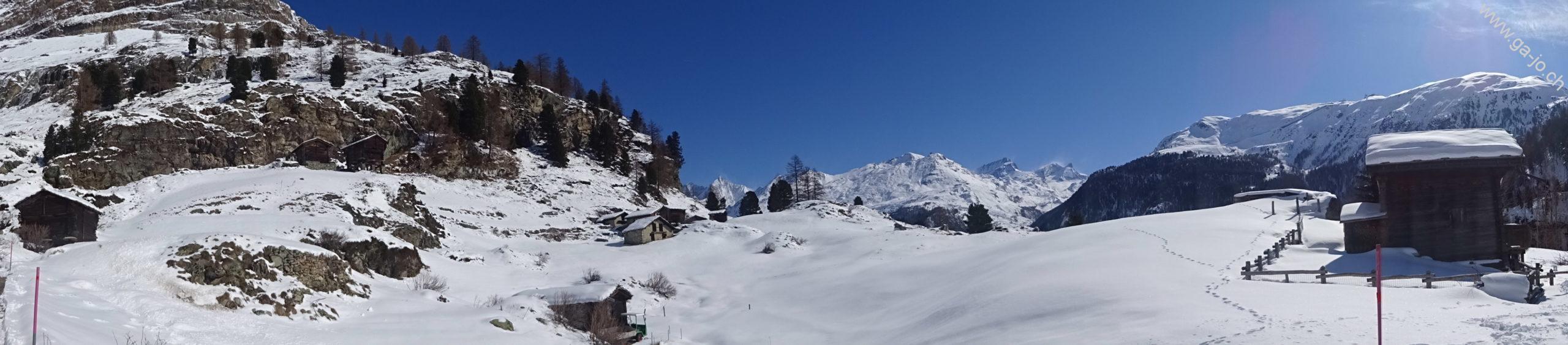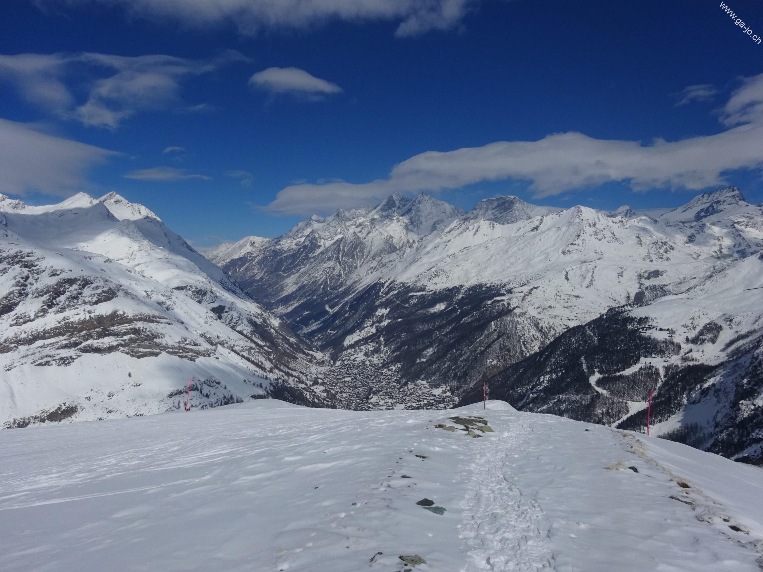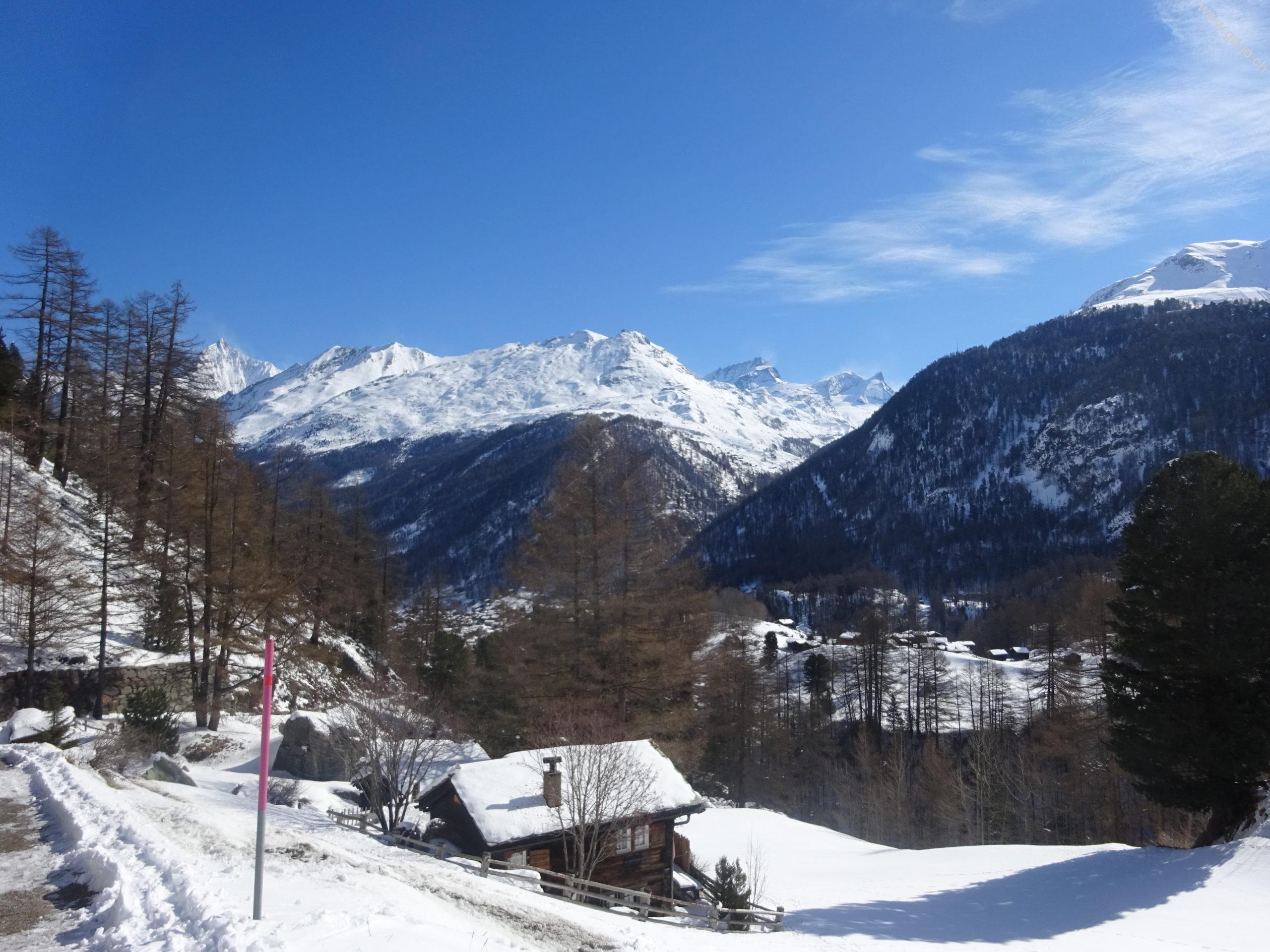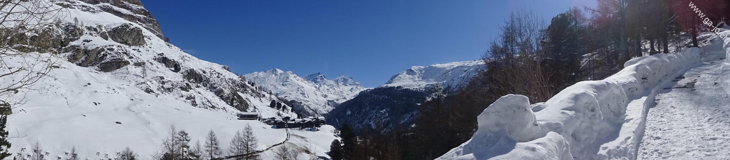 De Schwarzsee, la vue s’ouvre sur l’autre côté de la vallée avec notamment le massif du Mont Rose. On redescend tout d’abord par l’arête, puis à flanc de coteau jusqu’à la forêt. La descente est assez exigeante mais le balisage est au top. On fini par arriver aux premiers hameaux, on peut enlever les raquettes et rentrer jusqu’à l’hôtel.