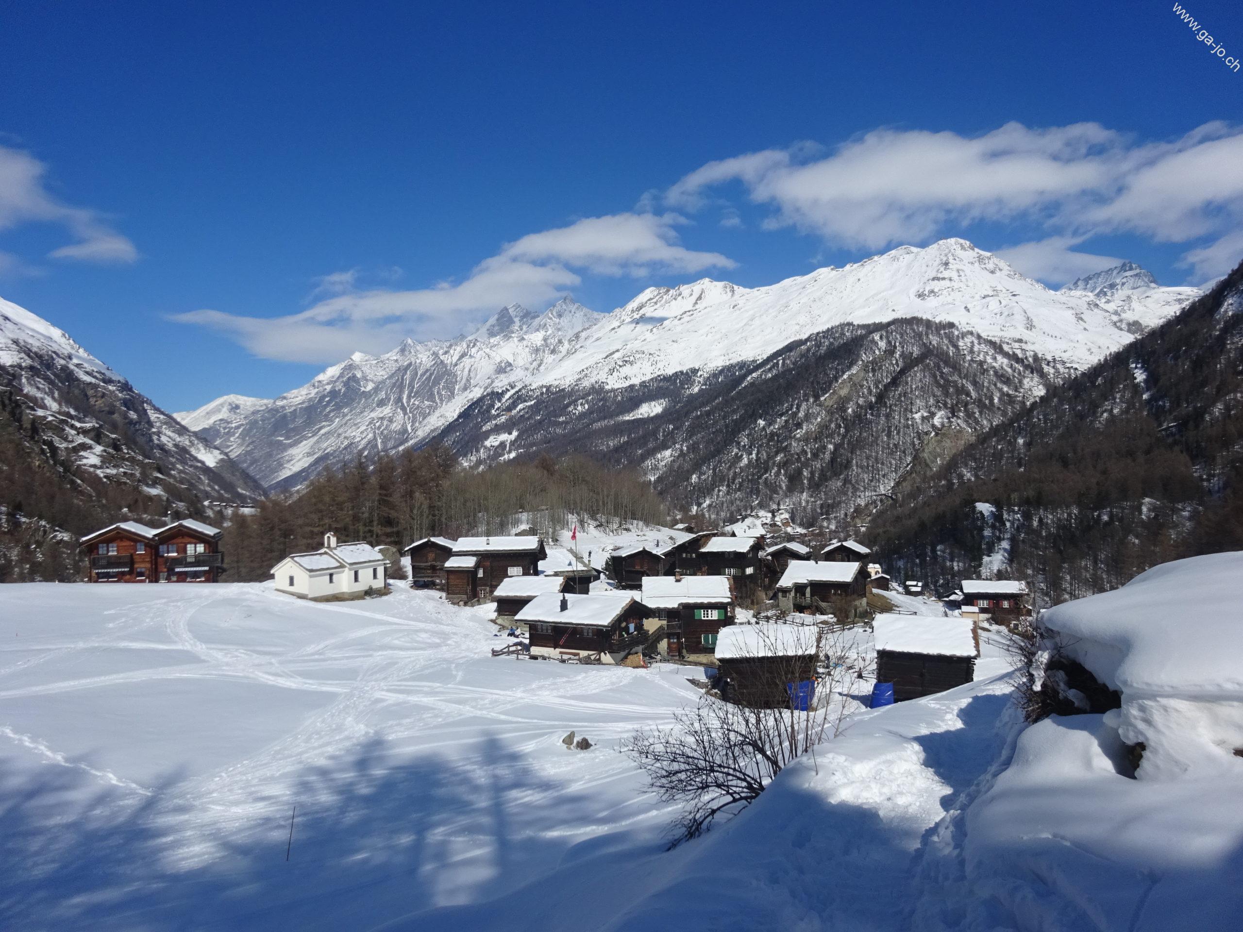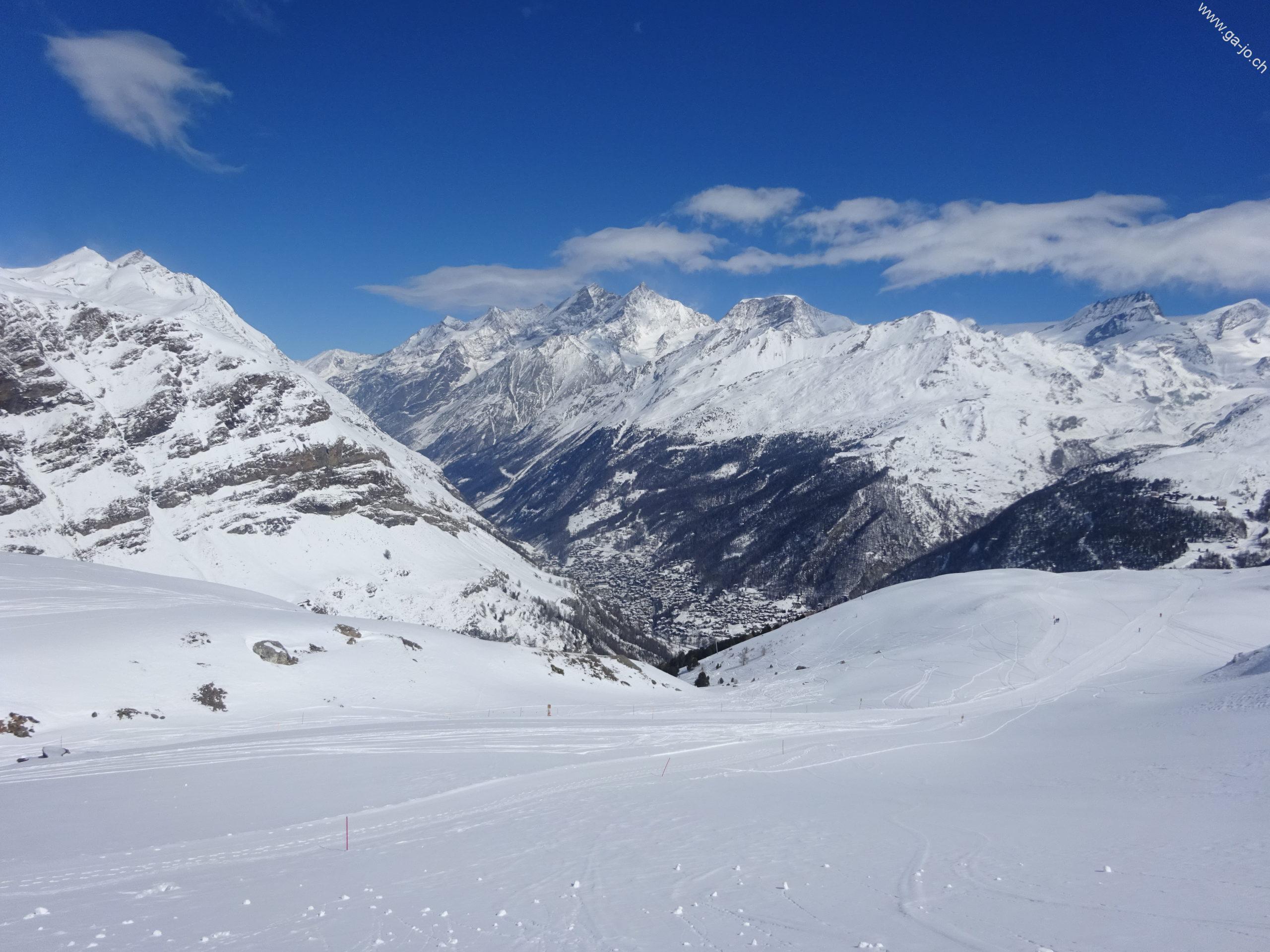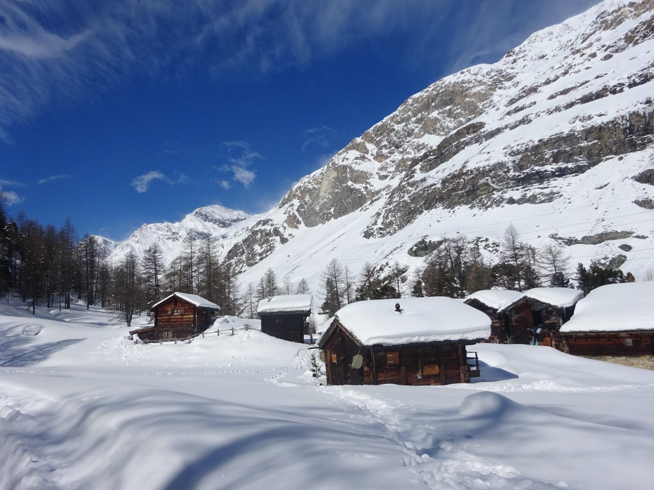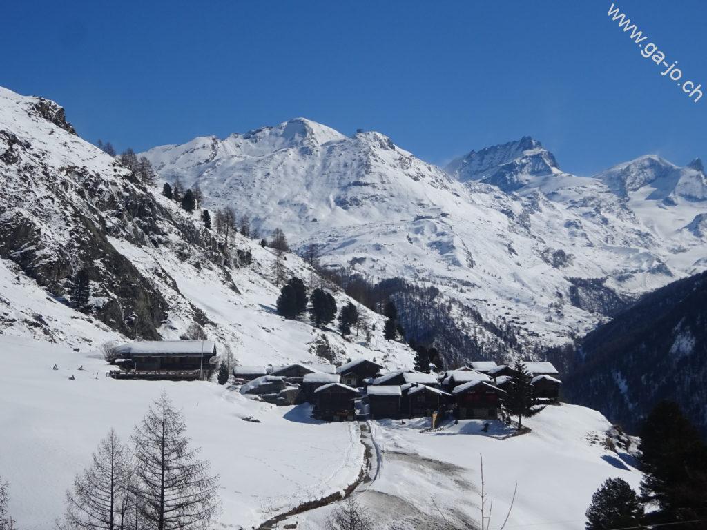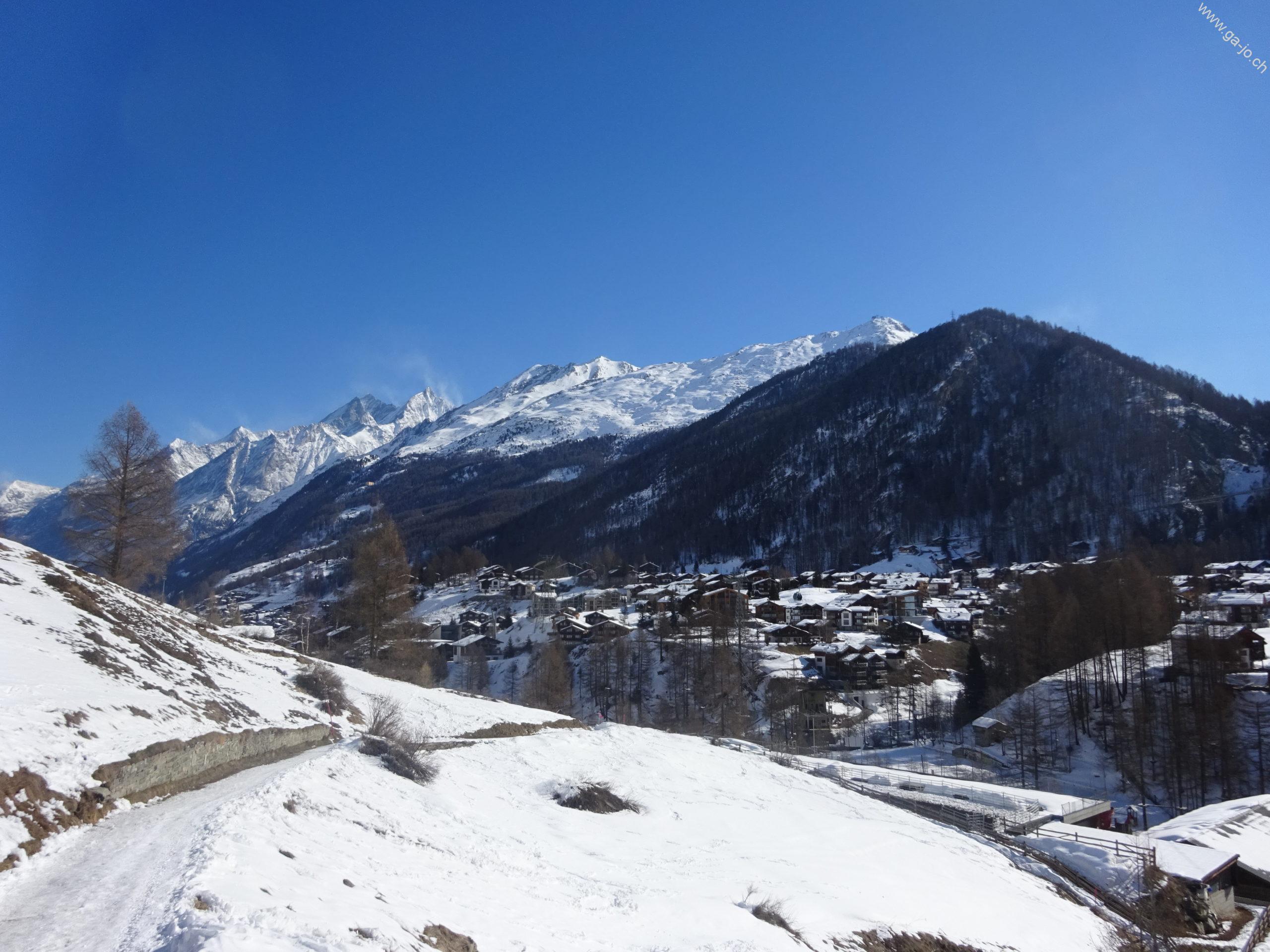 De Schwarzsee, la vue s’ouvre sur l’autre côté de la vallée avec notamment le massif du Mont Rose. On redescend tout d’abord par l’arête, puis à flanc de coteau jusqu’à la forêt. La descente est assez exigeante mais le balisage est au top. On fini par arriver aux premiers hameaux, on peut enlever les raquettes et rentrer jusqu’à l’hôtel.
