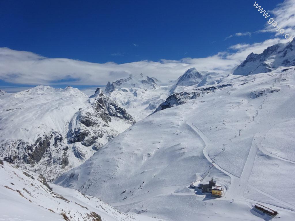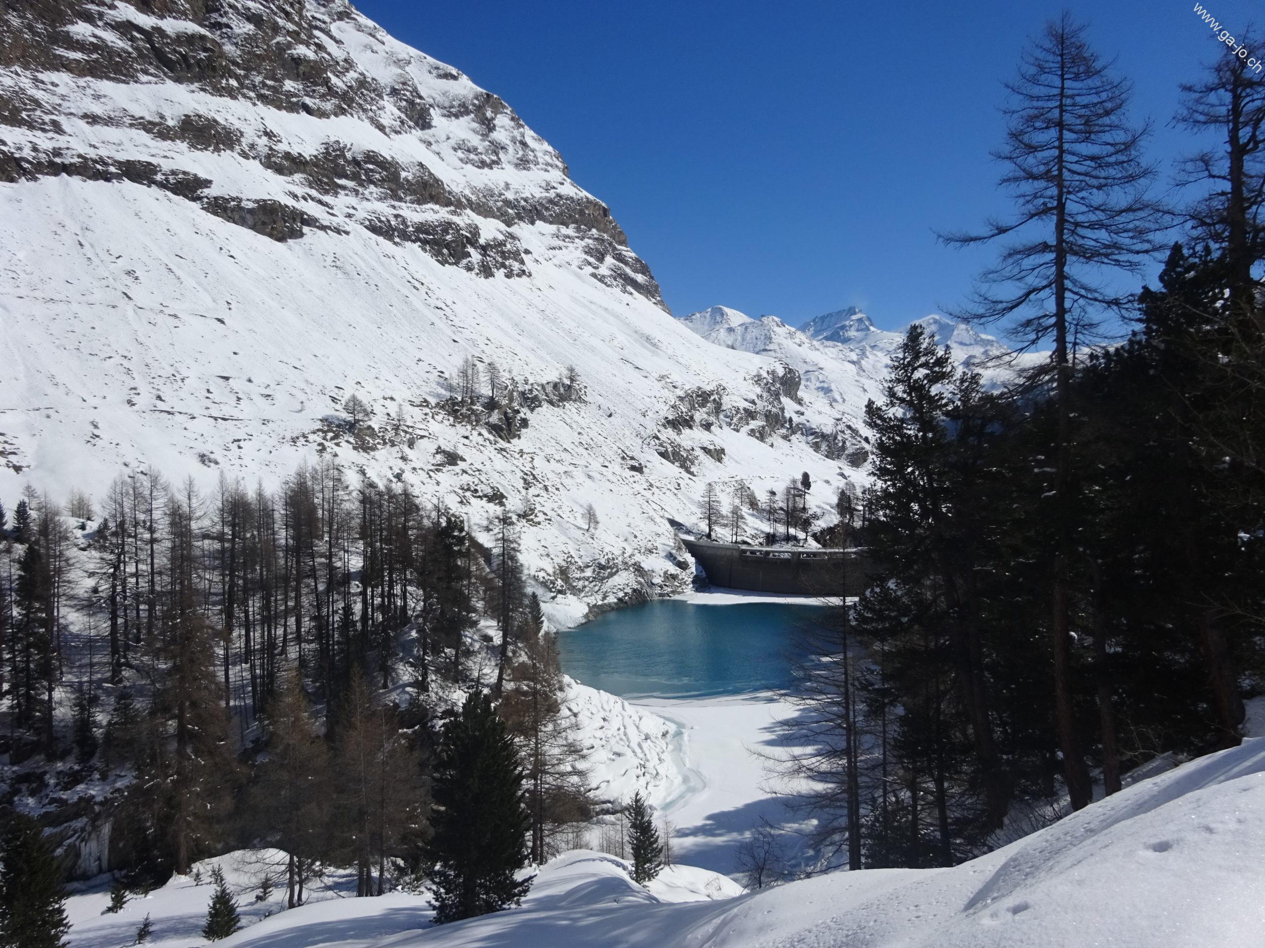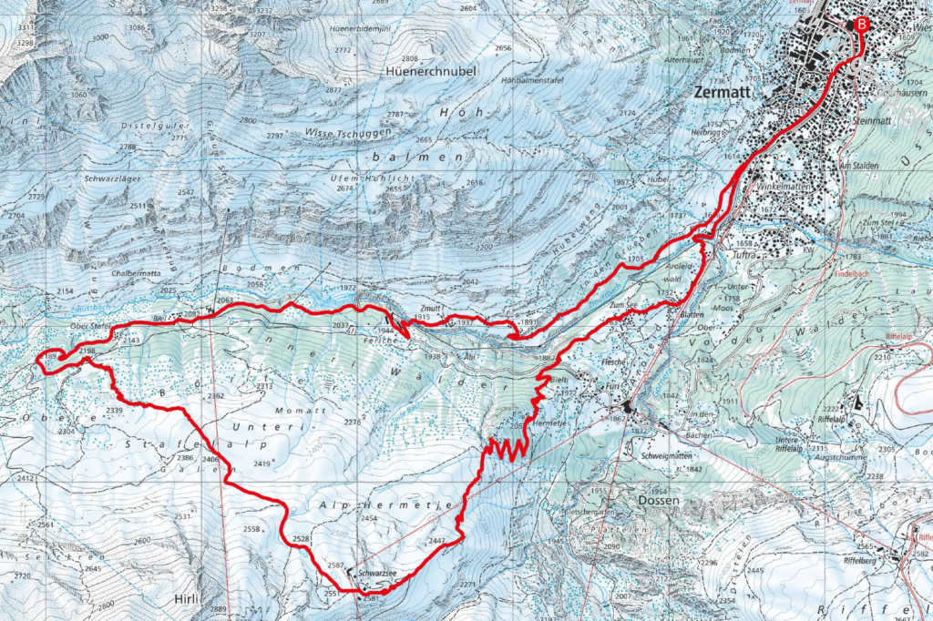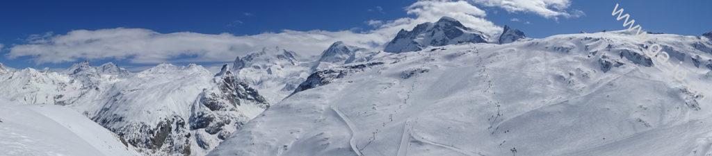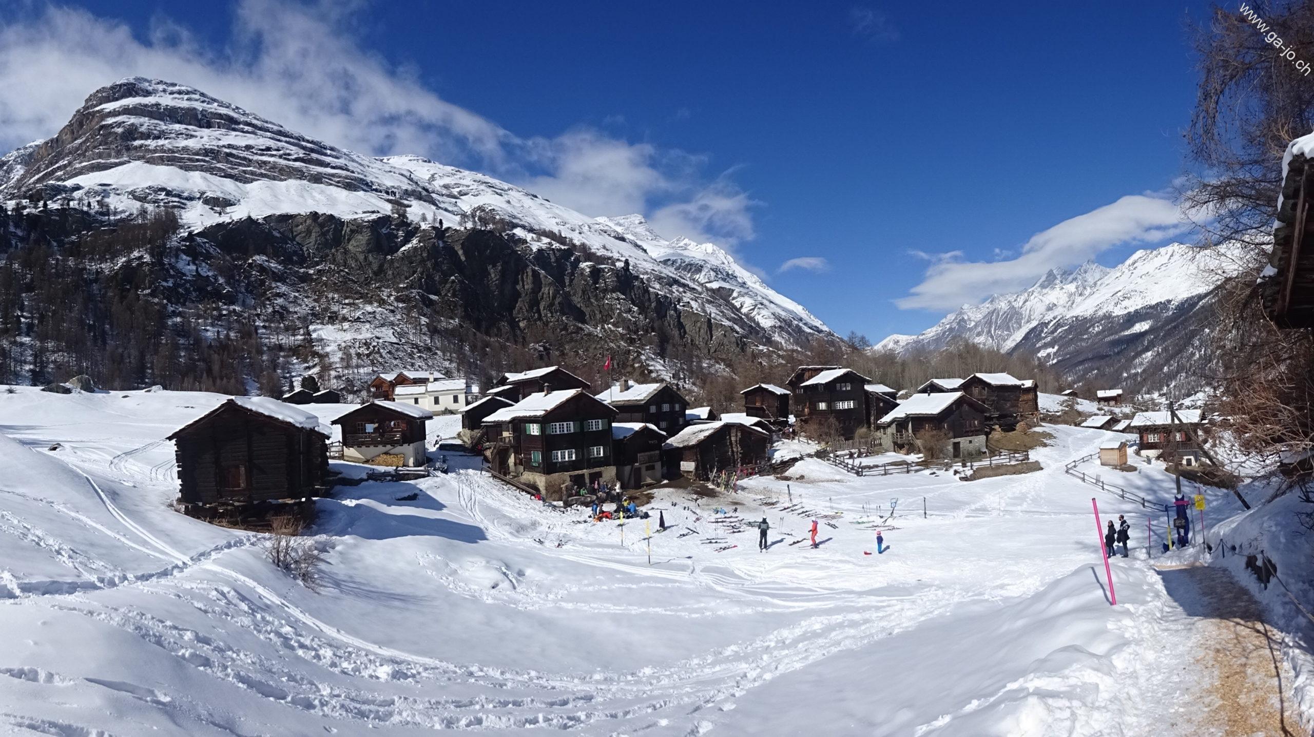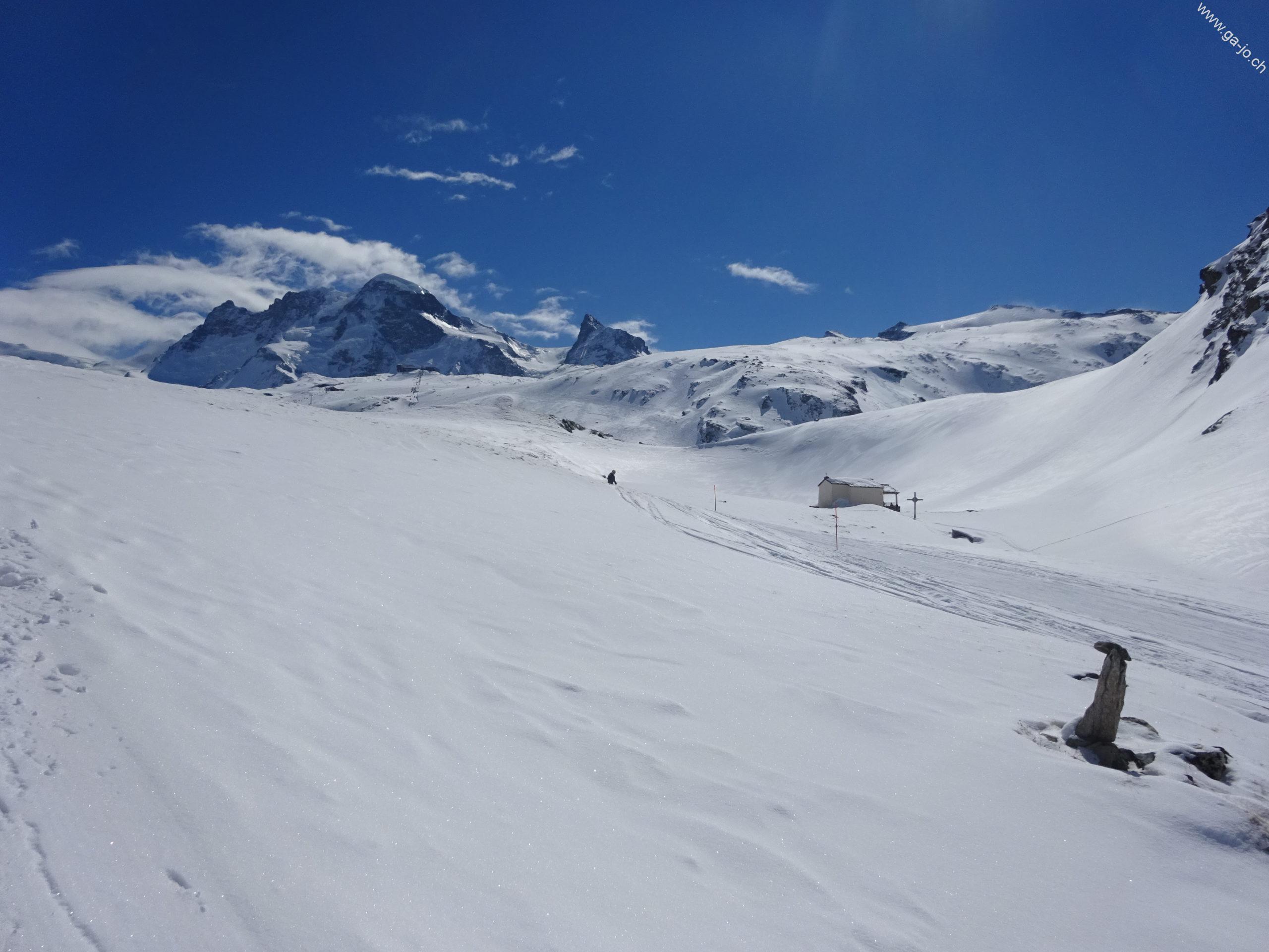 De Schwarzsee, la vue s’ouvre sur l’autre côté de la vallée avec notamment le massif du Mont Rose. On redescend tout d’abord par l’arête, puis à flanc de coteau jusqu’à la forêt. La descente est assez exigeante mais le balisage est au top. On fini par arriver aux premiers hameaux, on peut enlever les raquettes et rentrer jusqu’à l’hôtel.