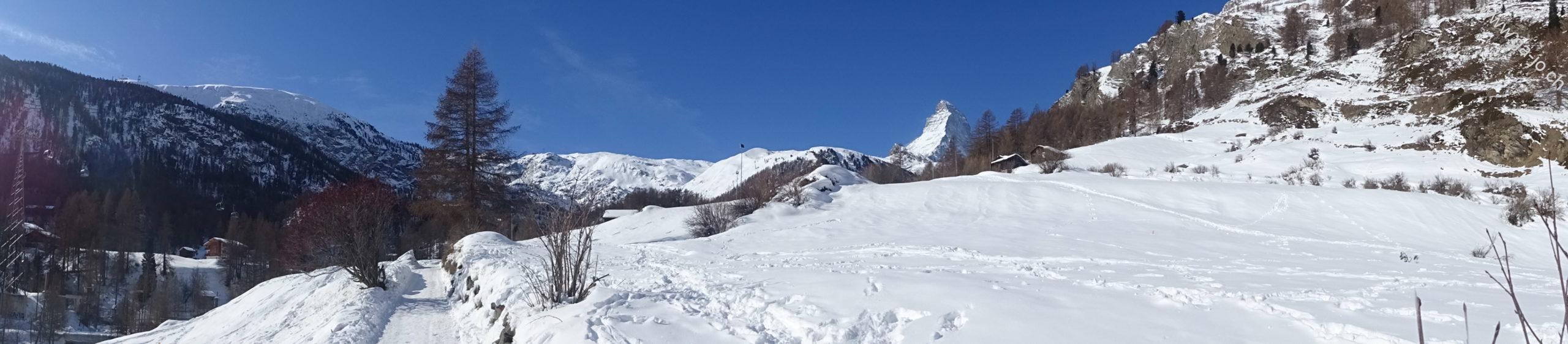 Zermatt est bien connue pour son domaine skiable, un peu moins pour ses sentier de randonnées hivernales et de raquettes. En hiver, les indicateurs jaunes disparaissent pour laisser place à la couleur rose sur un certain nombre d’itinéraire bien préparés et sécurisés. On déplorera juste que le plan de ces chemin ne soit fourni que sur un dépliant très très peu précis au lieu d’une vraie carte Swisstopo où les distances, dénivelés, et potentielles difficultés sont plus facile à évaluer (pour autant qu’on sache la lire).