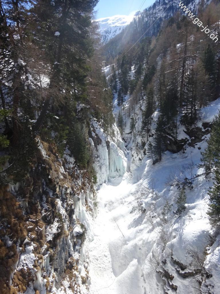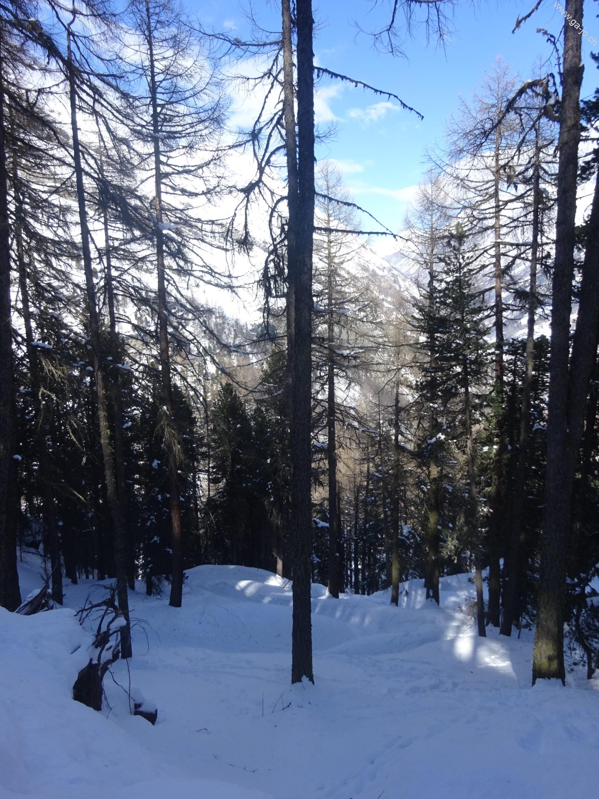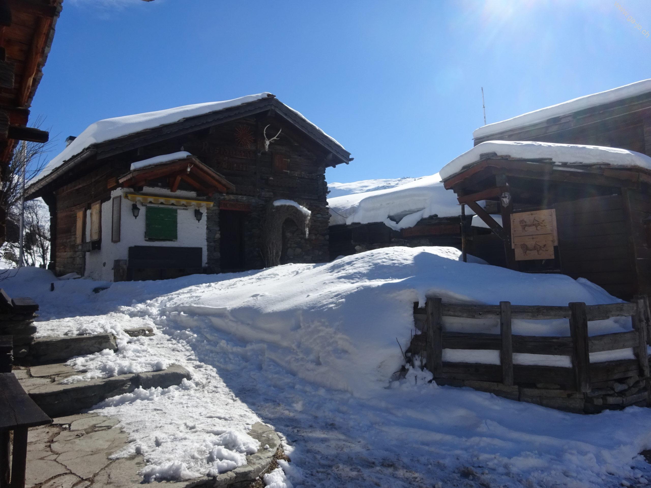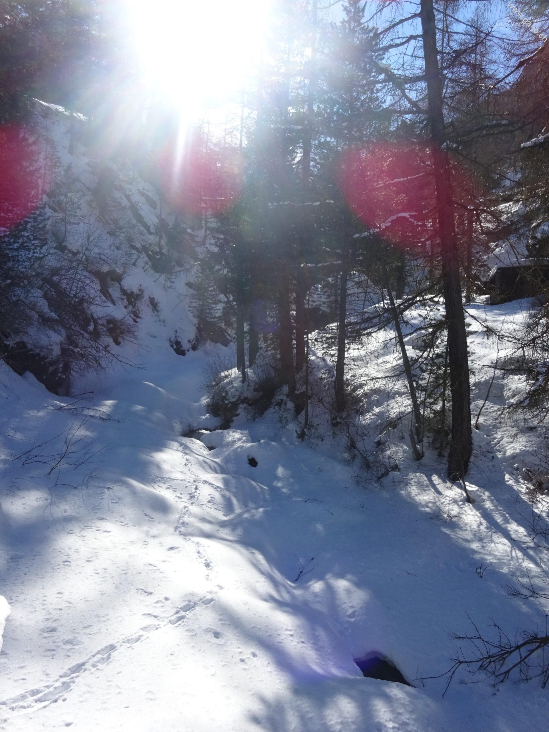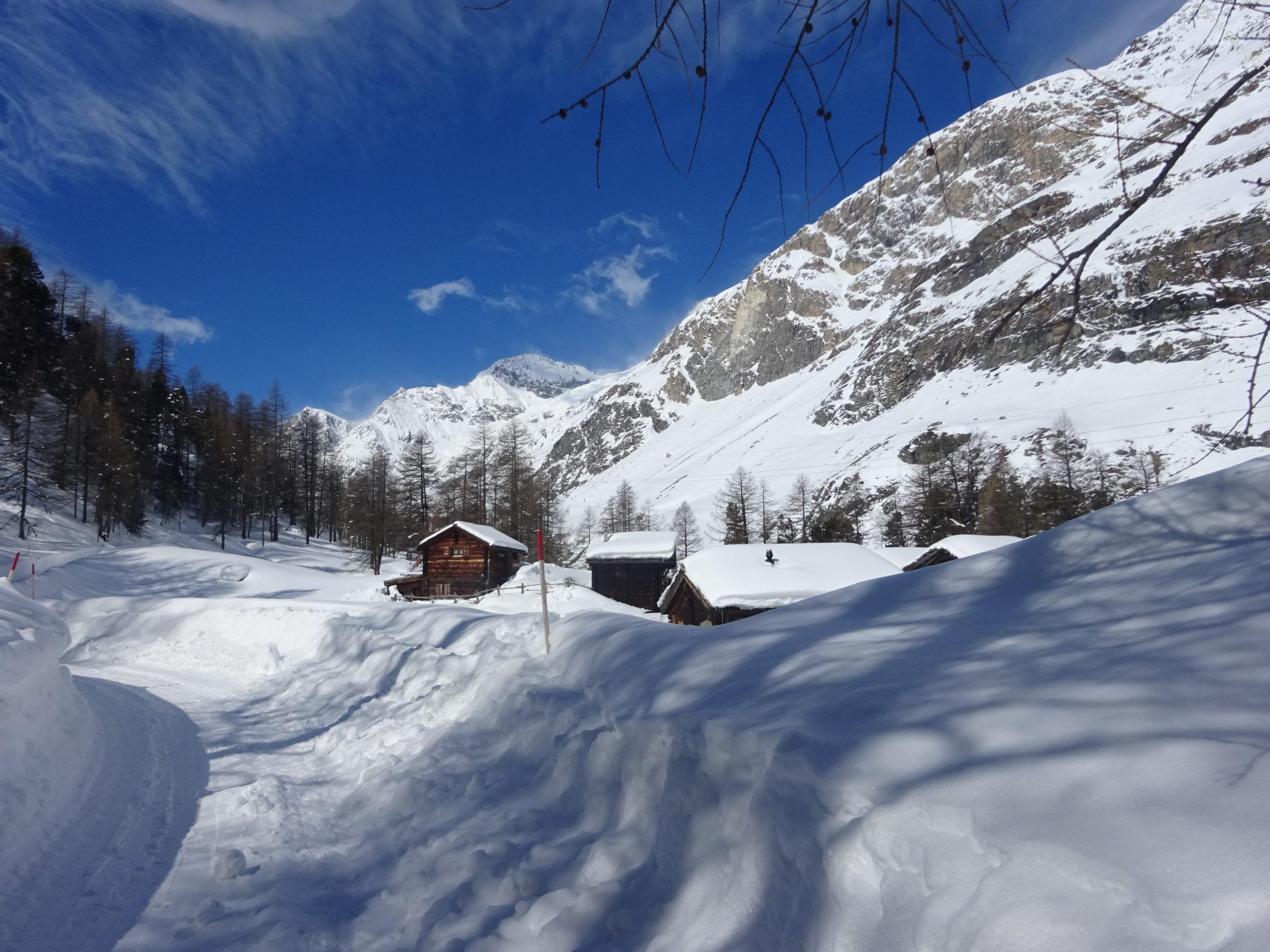 On traverse d’abord le village à pieds pour s’engager sur le chemin de randonnée en direction Z’mutt. Pas besoin de chausser les raquettes pour l’instant, le chemin est déneigé et/ou bien tassé.