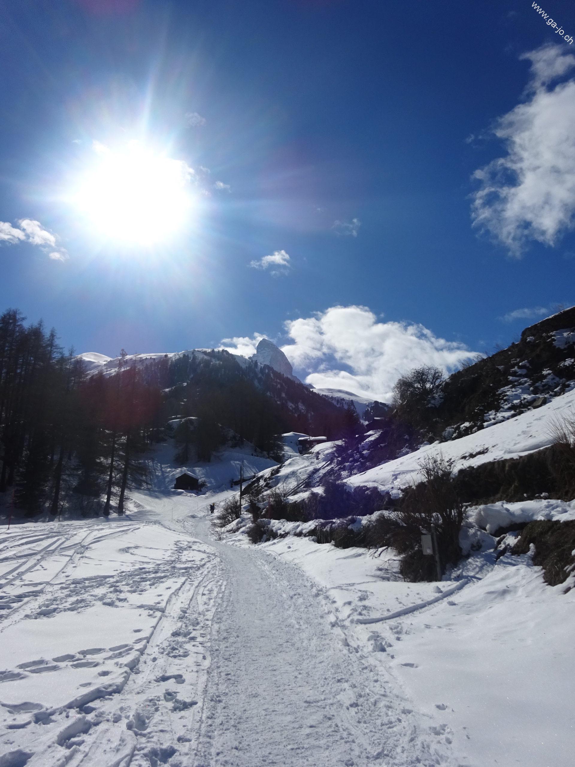 On traverse d’abord le village à pieds pour s’engager sur le chemin de randonnée en direction Z’mutt. Pas besoin de chausser les raquettes pour l’instant, le chemin est déneigé et/ou bien tassé.